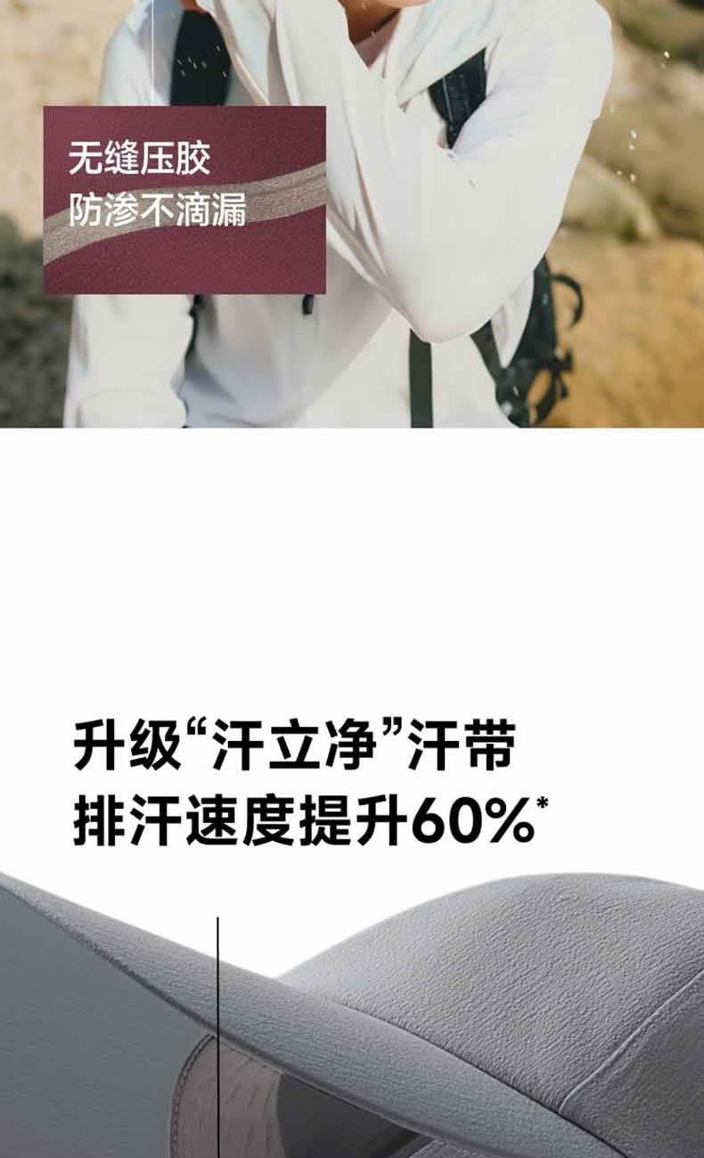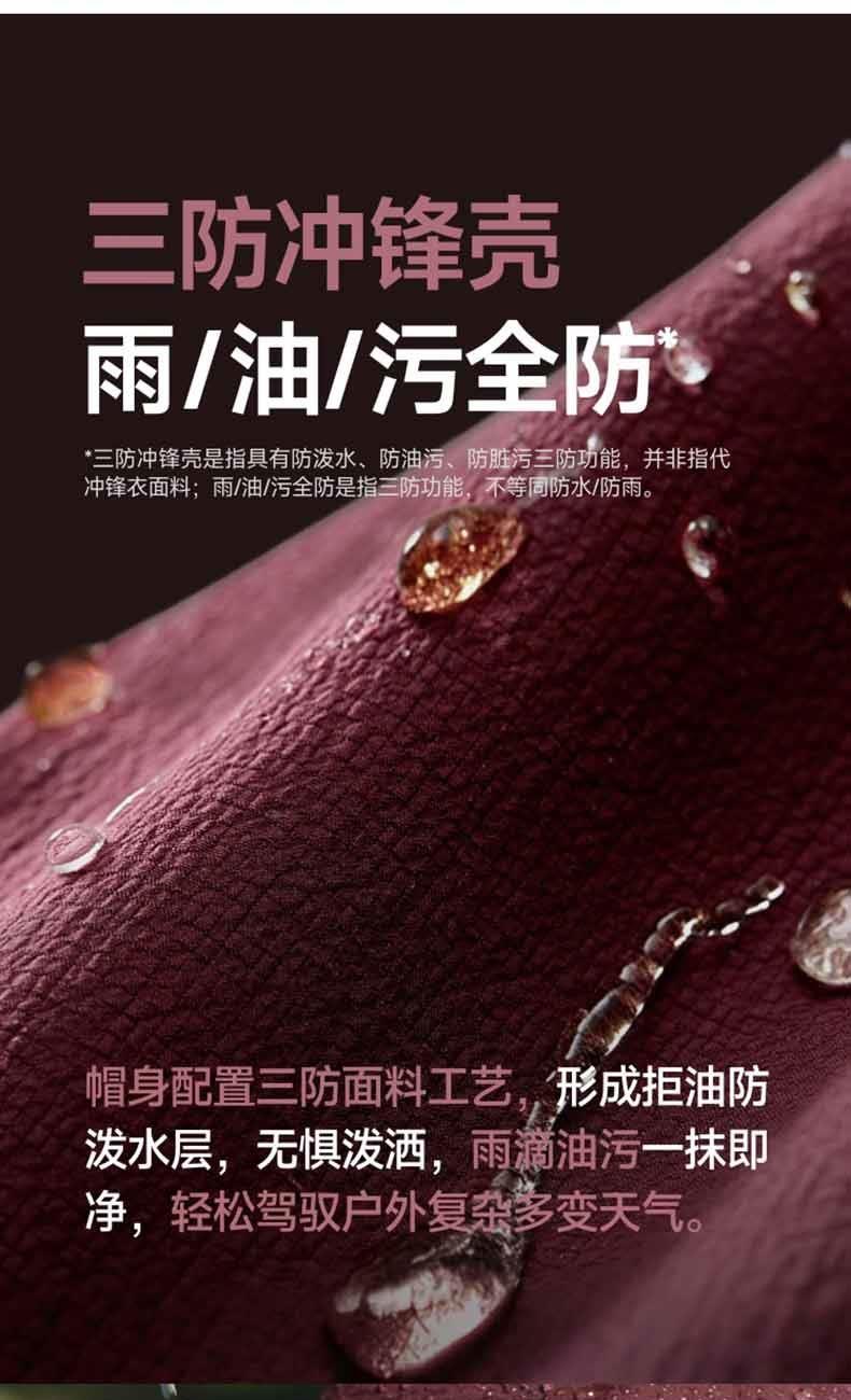 三防面料工艺、利落耐脏好打理 双重呼吸结构、快速排湿、透气不闷 魔术贴调节带、贴合头部、佩戴稳固