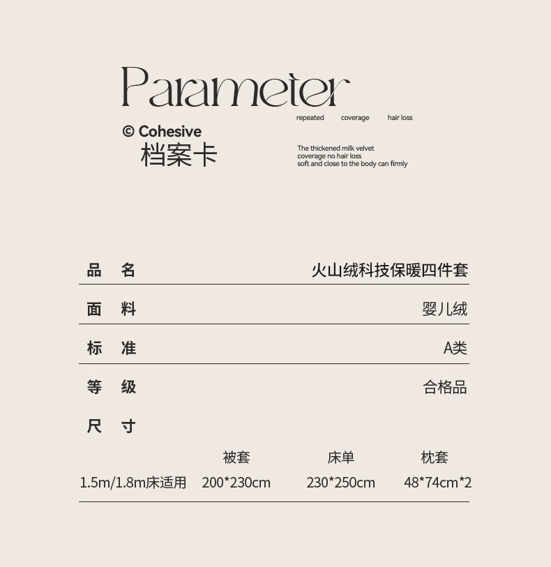 面 料: 火山绒 规 格: 被套200*230cm 床单230*250cm 枕套48*74cm*2 包 装:礼盒 克 重:2200g