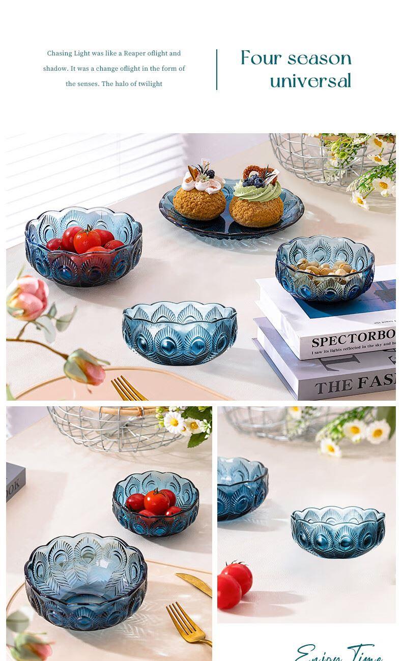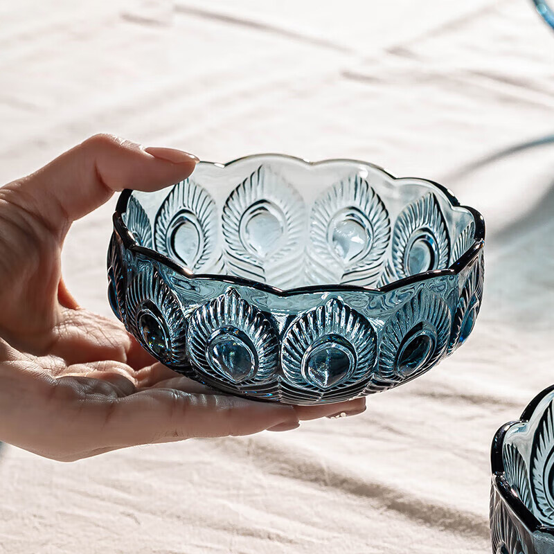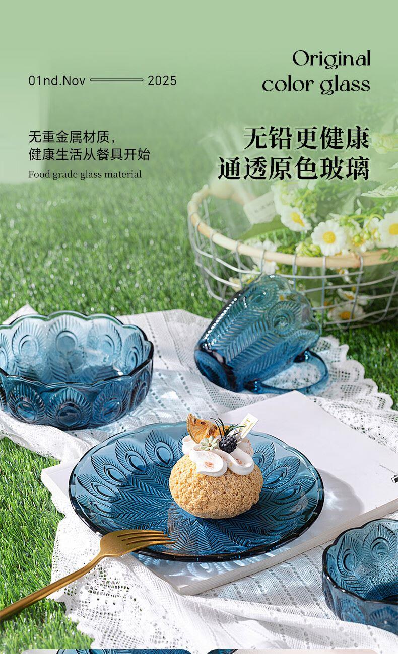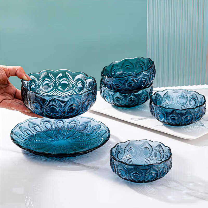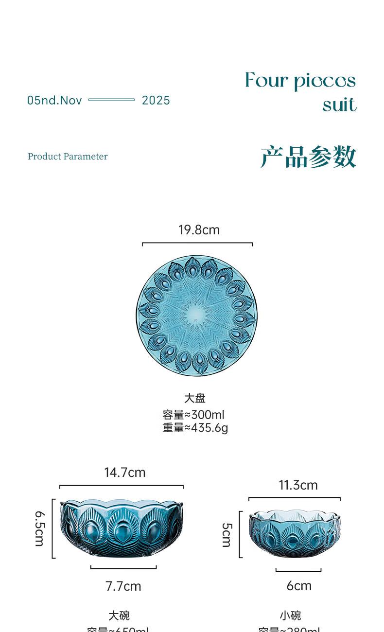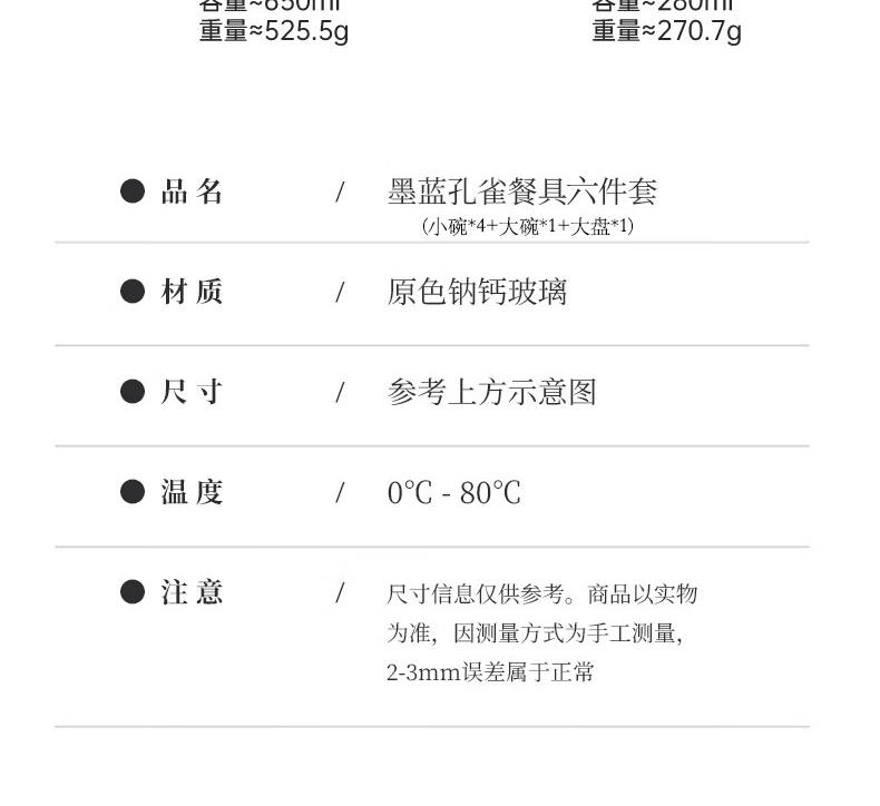 产品材质:钠钙玻璃 产品参数:大碗650ml*1、小碗280ml*4、杯子300ml*2,盘子195mm*1 颜 色:墨蓝色 装 箱毛重:6套 /箱,17.3kg 彩盒尺寸:45.5*11.2*21cm 外箱体积:47*35*44cm