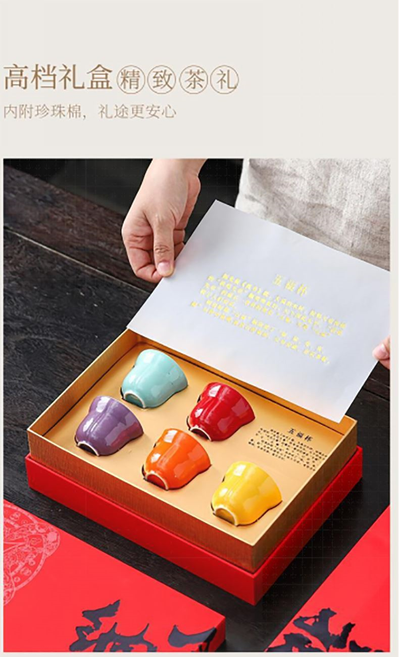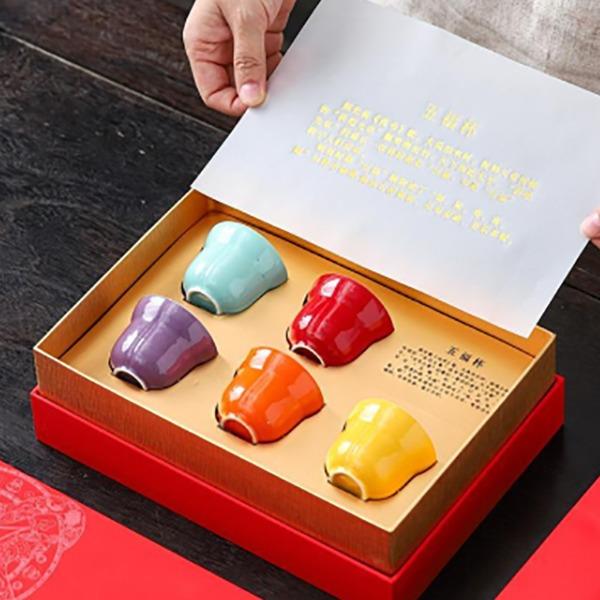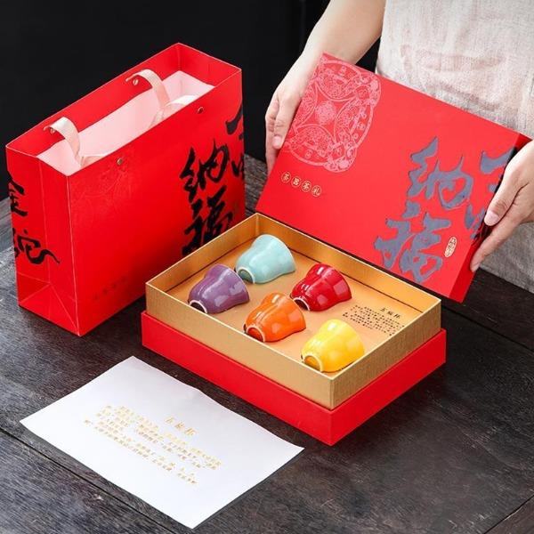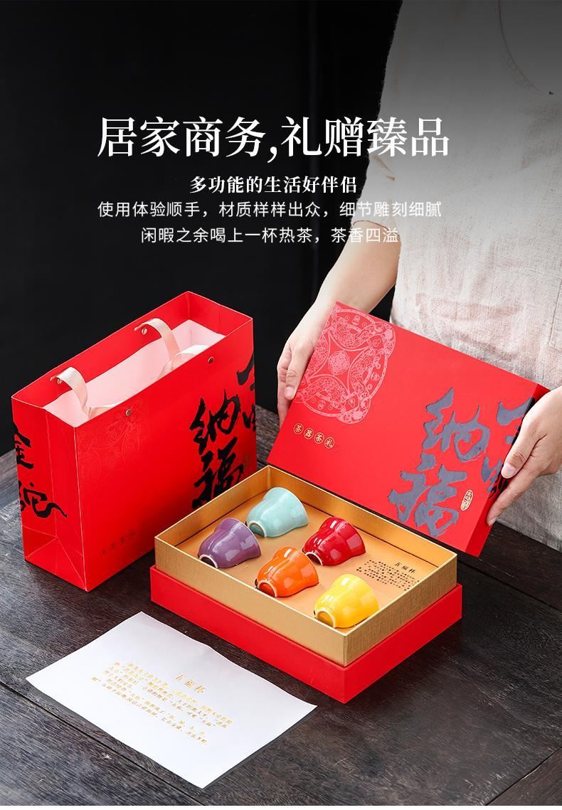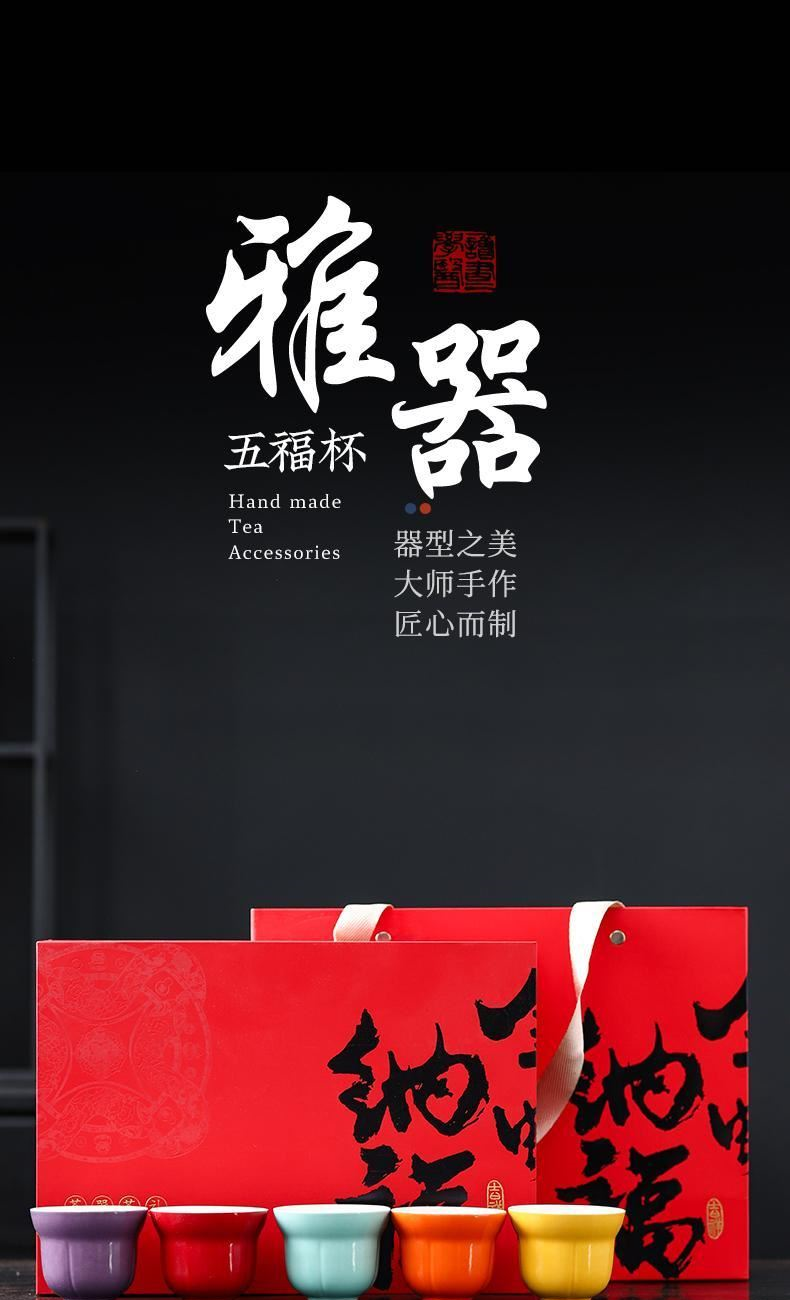 配置:五福杯子*5+礼盒*1*手提袋*1 材质/工艺:德化窑陆宝红色 装 箱数;30套 /箱 礼盒尺寸:25*18*8cm