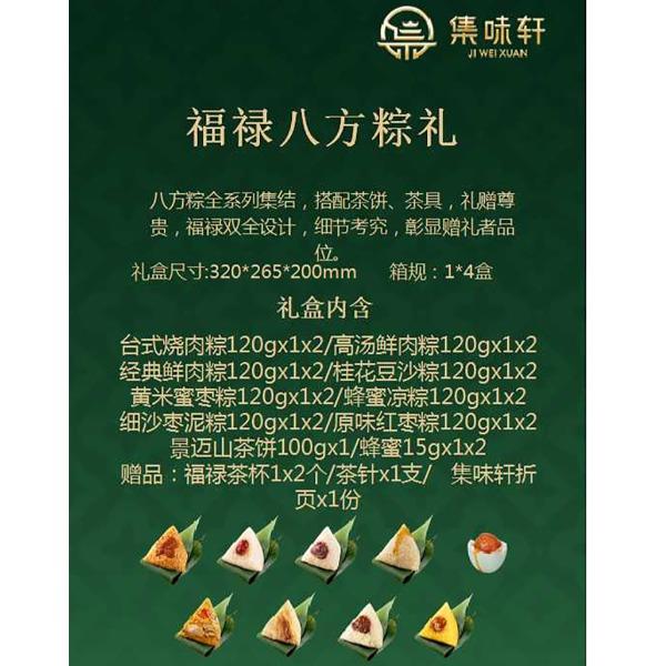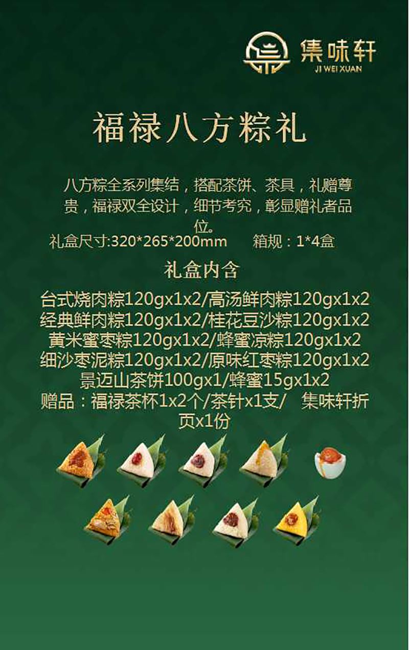 台式烧肉粽120gx1x2 高汤鲜肉粽120gx1x2 经典鲜肉粽120gx1x2 桂花豆沙粽120gx1x2 黄米蜜枣粽120gx1x2 蜂蜜凉粽120gx1x2 细沙枣泥粽120gx1x2 原味红枣粽120gx1x2 景迈山茶饼100gx1 蜂蜜15gx1x2 赠品:福禄茶杯1x2个 茶针x1支 集味轩折页x1份