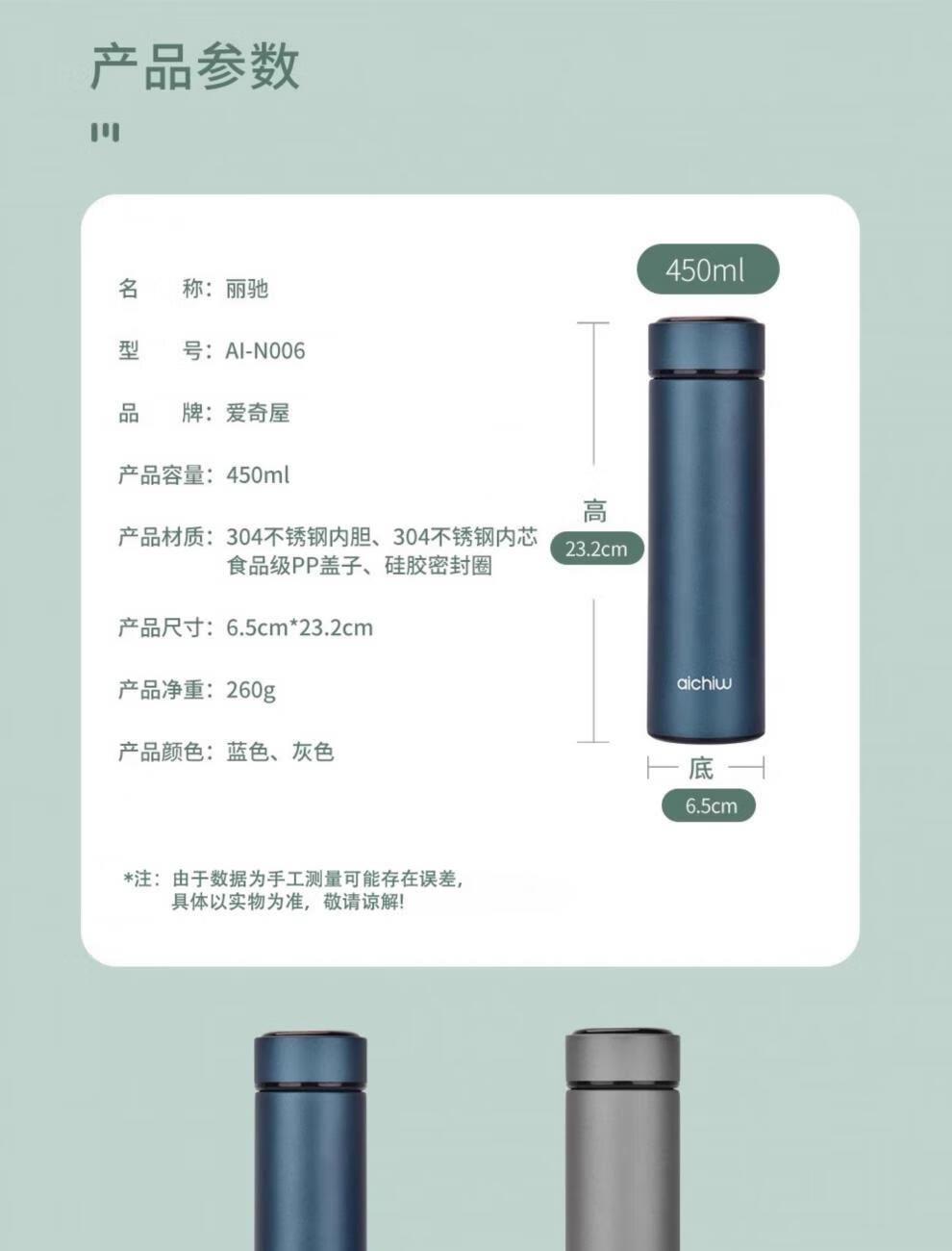 型号:AI-N006 颜色:A蓝色;B灰色 规格:450ml 装 箱率:50只/箱 材质:内304、外201不锈钢