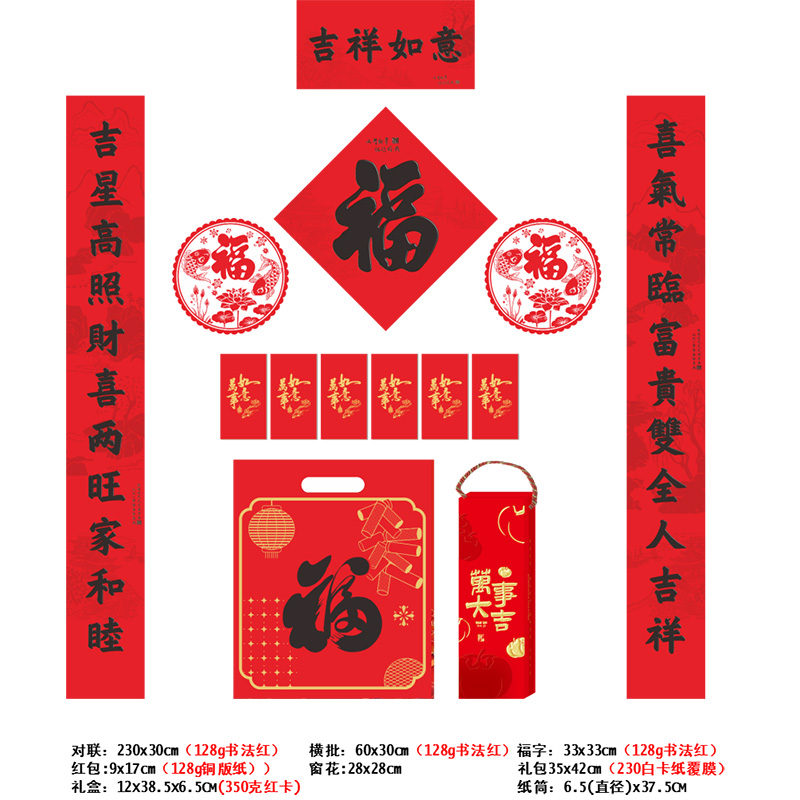 对联:230x30cm(128g书法红) 横批:60x30cm(128g书法红)福字:33x33cm(128g书法红) 红包:9x17cm(128g铜版纸)) 窗花:28x28cm 礼包35x42cm(230白卡纸覆膜) 礼盒:12X38.5X6.5CM(350克红卡) 纸筒:6.5(直径)x37.5CM