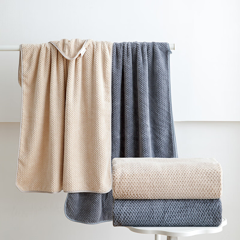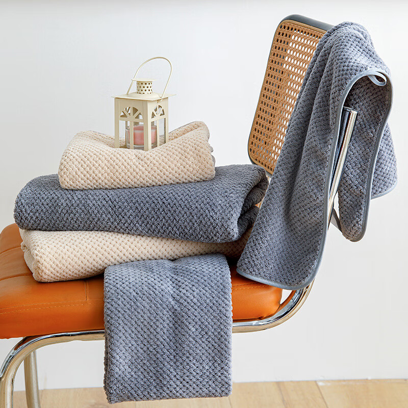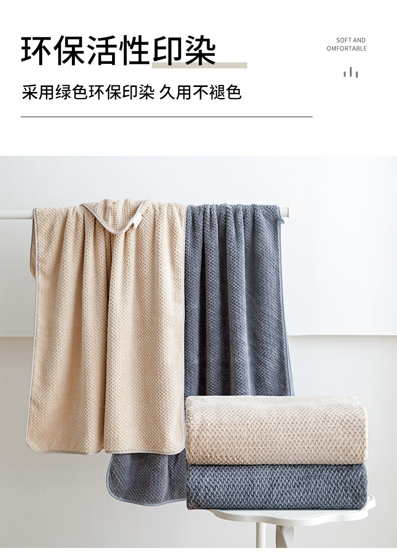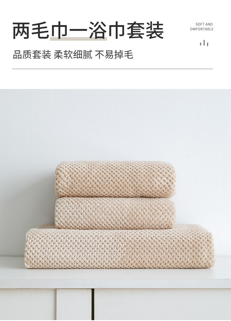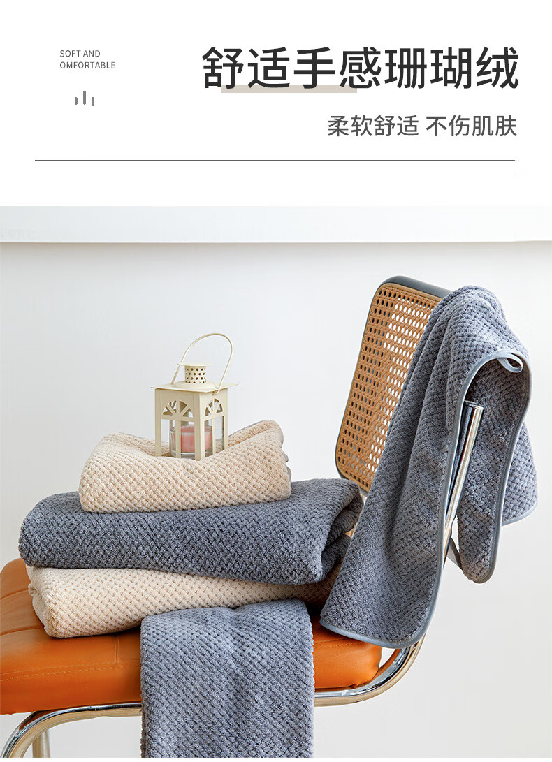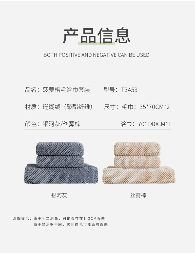 材质 :珊瑚绒(聚酯纤维) 规格:毛巾:35*70cm*2 浴巾:70*140cm*1 货号:T3453 颜色: 银河灰/丝雾棕 包装: 手提礼盒 包装尺寸: 34.5*8*20.5cm 箱 规: 20盒 /箱