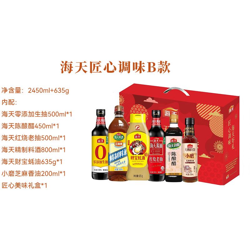 净含量:2450ml+635g内配: 海天零添加生抽500ml*1 海天陈酿醋450ml*1 海天红烧老抽500ml*1 海天精制料酒800ml*1 海天财宝蚝油635g*1 小磨芝麻香油200ml*1 匠心美味礼盒*1