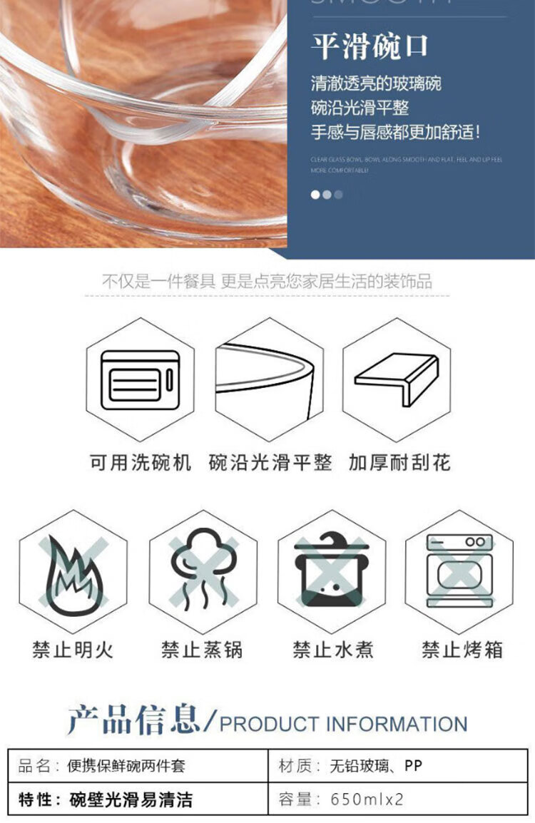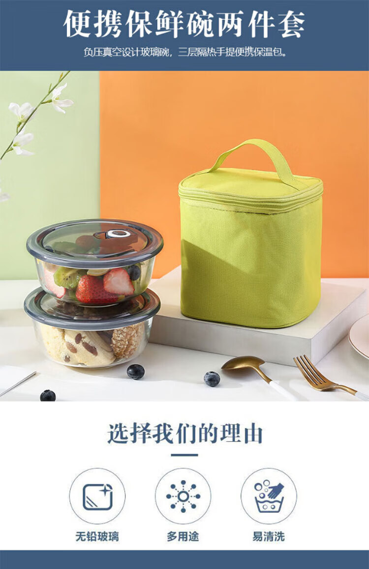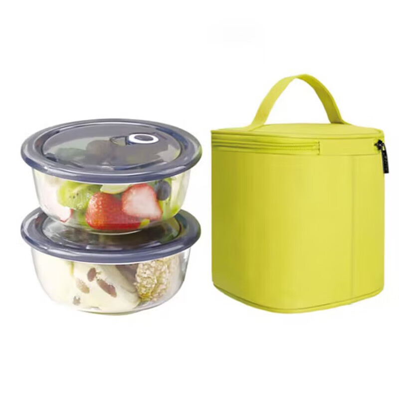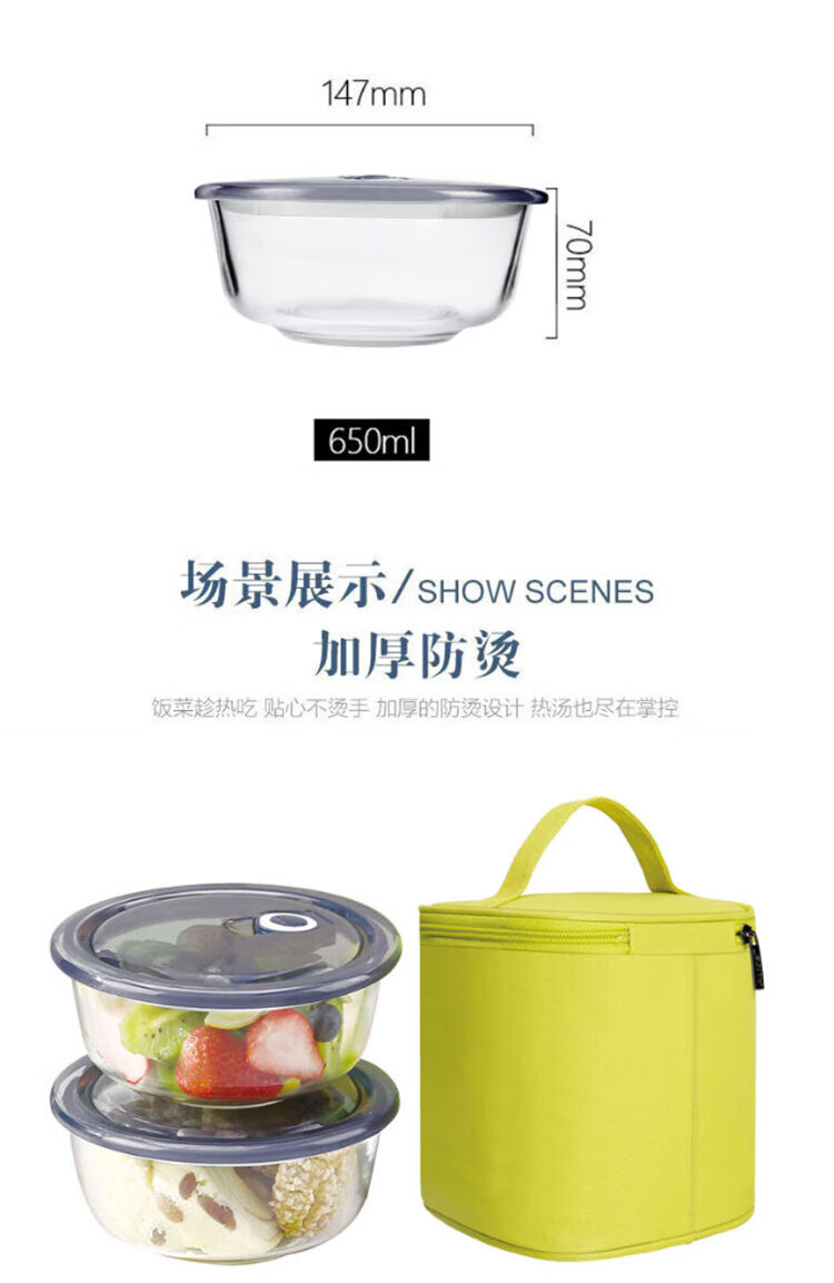 产品型号:JT10228 产品容量:650ML*2(2中号) 产品材质:碗-钠钙耐热玻璃、盖-食品级PP、密封圈-硅胶树脂、包-600D牛津布 产品尺寸:161mm*161mm*148mm 装 箱数量:18pcs 外箱尺寸:490mm*350mm*460mm 产品条码:6970653081180