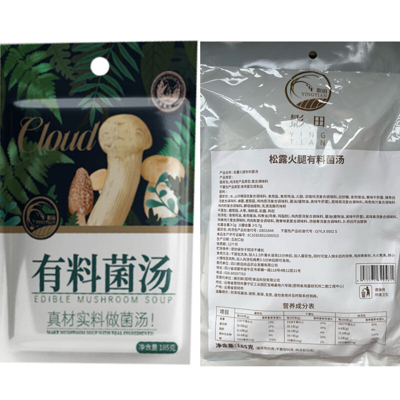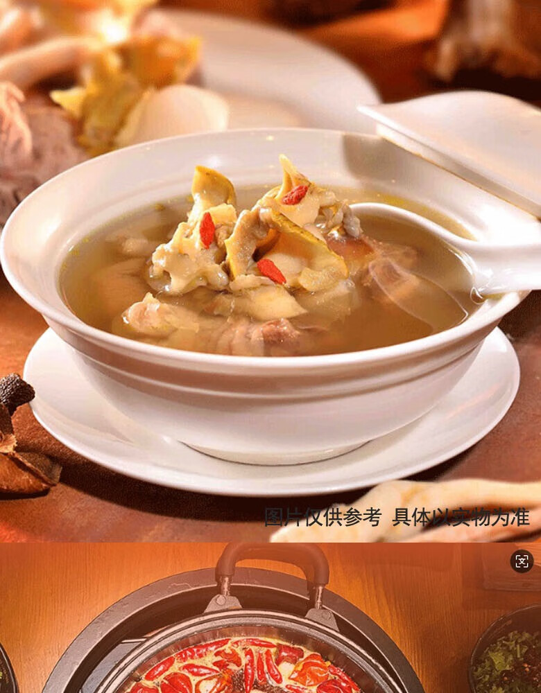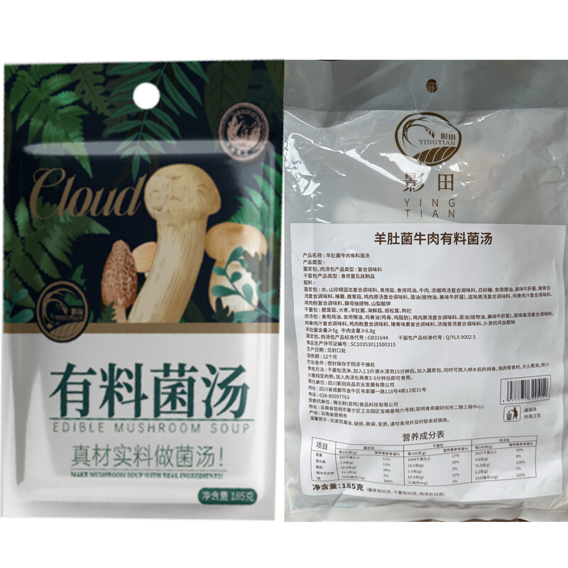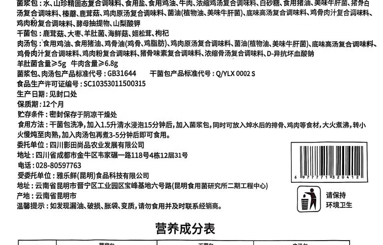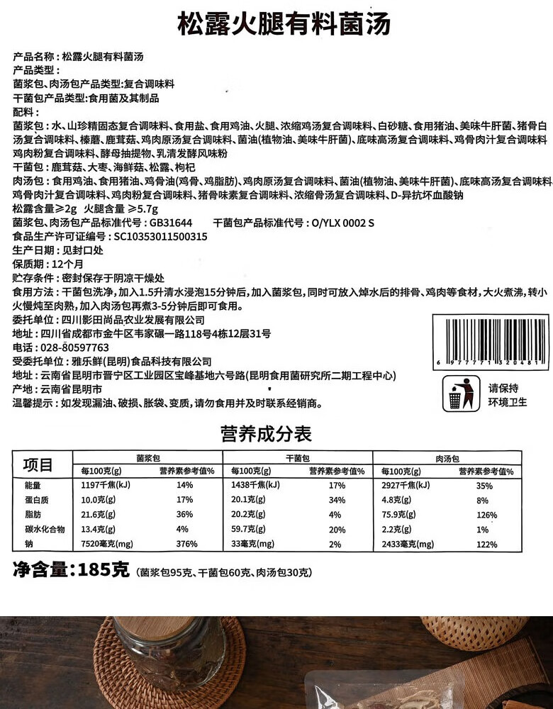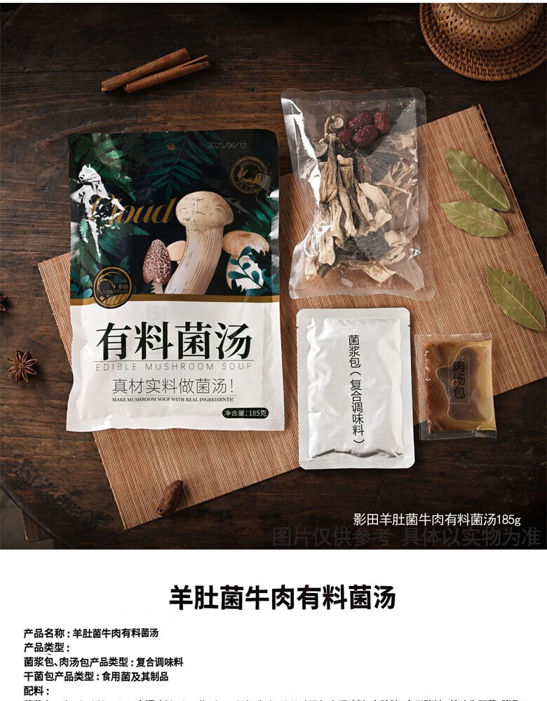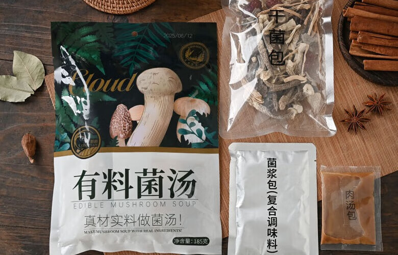 1、干菌包:里面有羊肚菌、鹿茸菇、红枣等,这个配置既不特别也特别,市面上的菌汤包里面的羊肚菌都是很小的,我们诚意满满,都是挑选的大朵的,里面用的鹿茸菇也是特级品质。 2、菌浆包:海底捞同款,我们工厂是给海底捞和锅圈代工的,里面的添加剂只有防腐剂,配料表很干净。 3、肉汤包:肉香味很浓,不用添加其他的辅材,让生活、烹饪变得更简单,让每个人都能成为大厨。
