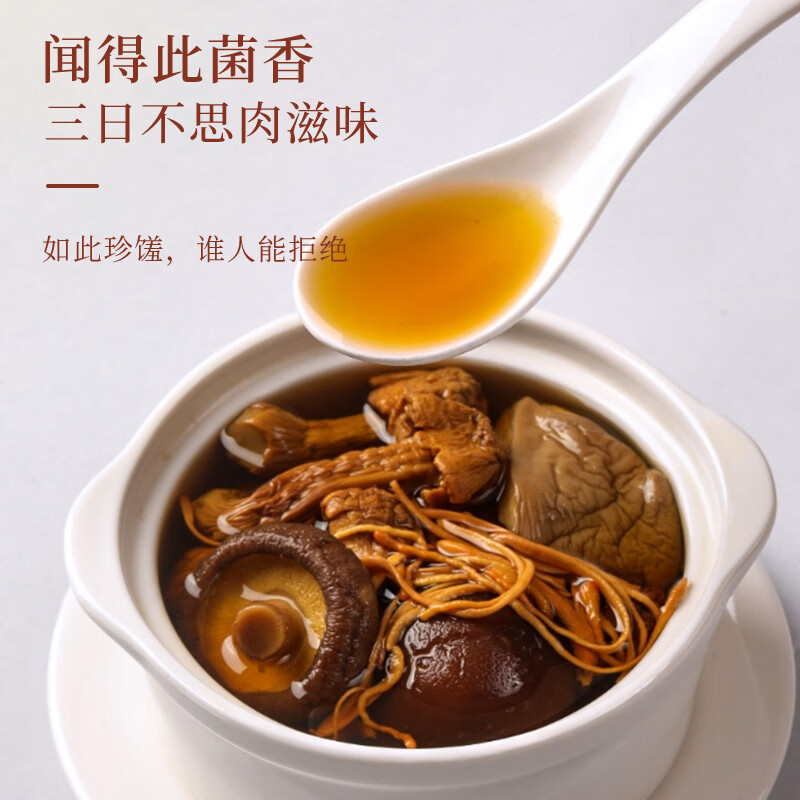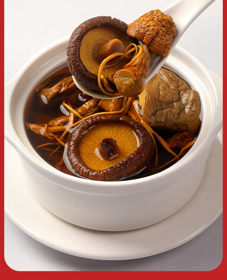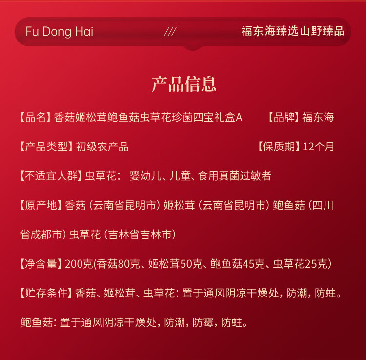 原料产地:广东 净含量:200克(香菇80克、姬松茸50克、鲍鱼菇45克、虫草花25克) 产品毛重:550g 彩盒尺寸:35*24*4cm 装 箱数量:10盒/箱