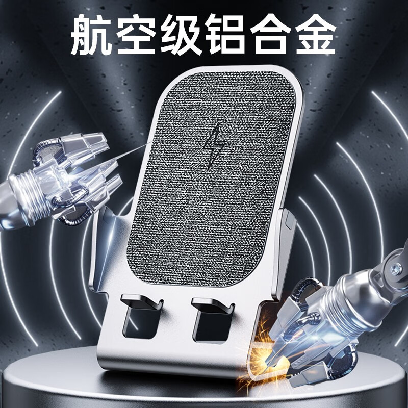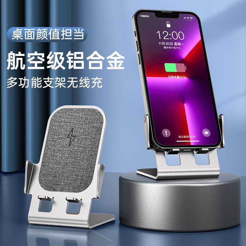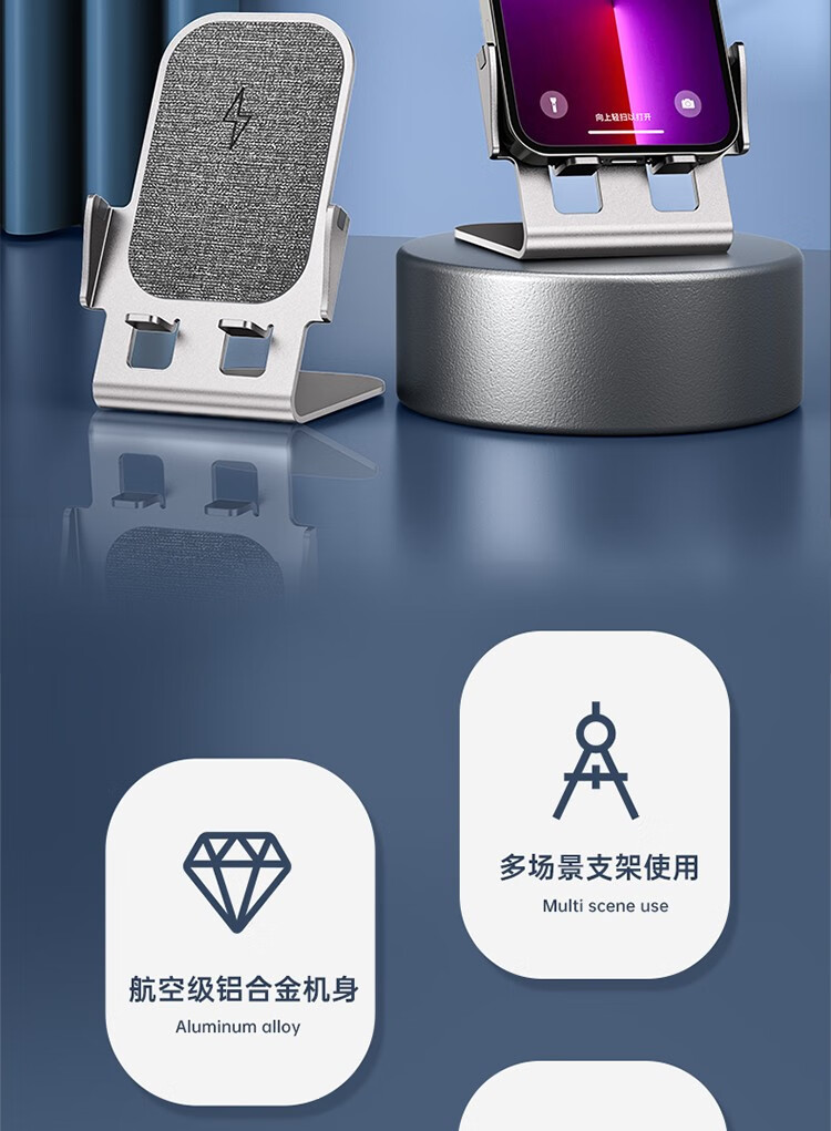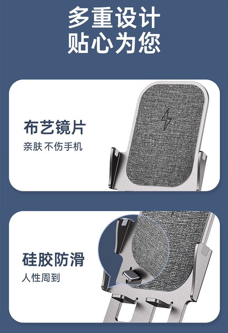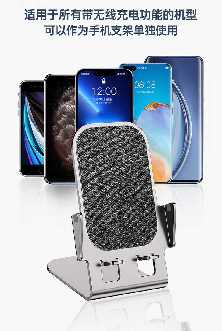 型号:W01 颜色:灰色(银/蓝/粉色1000起订) 材质:铝合金+PU布纹 手机充电功率:5W/7.5W/10W/15W 输入功率:5V⎓2A/9V⎓2A 输入接口:Type-C 产品尺寸:138*95*118mm 包装尺寸:90*156*109mm 产品重量:180g