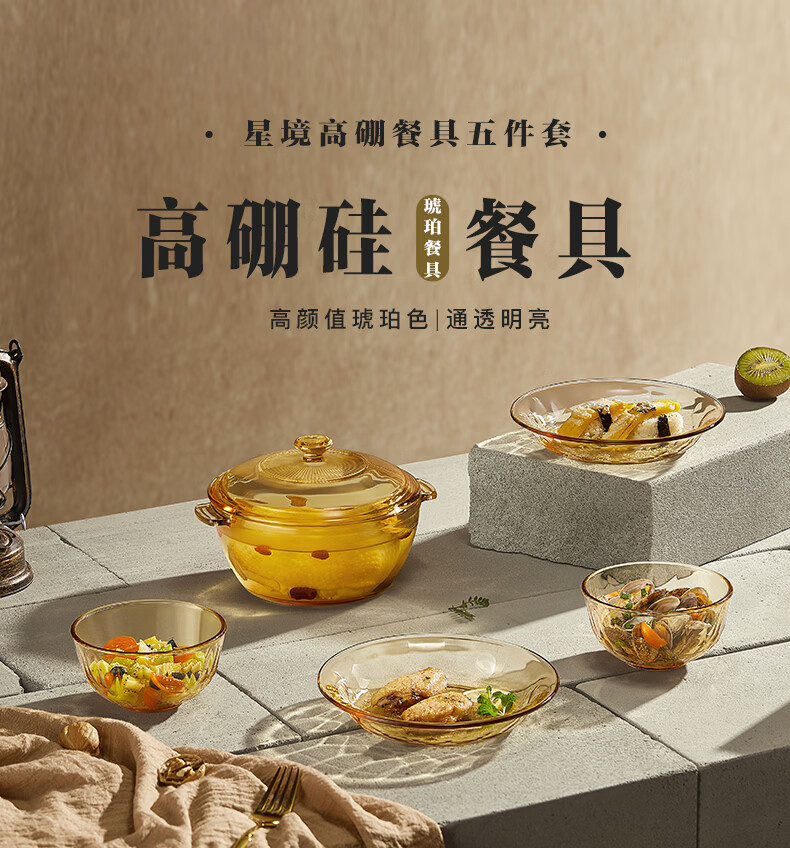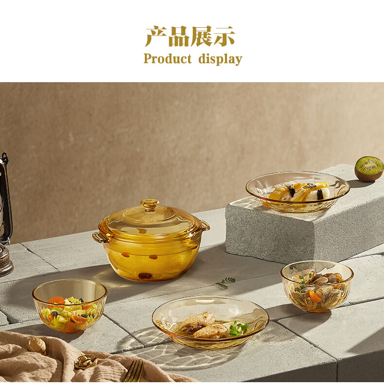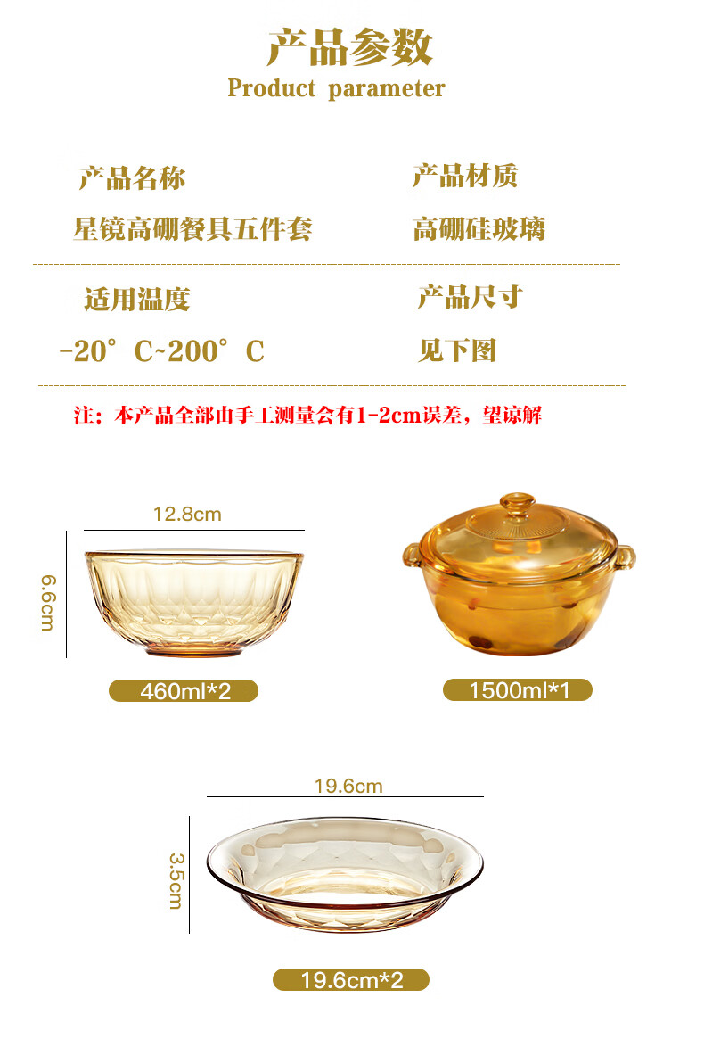 装 箱 规格:6套 /箱适用温度:-20°C-200°C材 质:高硼硅玻璃产品参数:小碗460ml*2、 盘196mm*2、高硼煲*1彩盒尺寸:402*112*345mm 外箱尺寸:69.6*41.6*36.1cm
