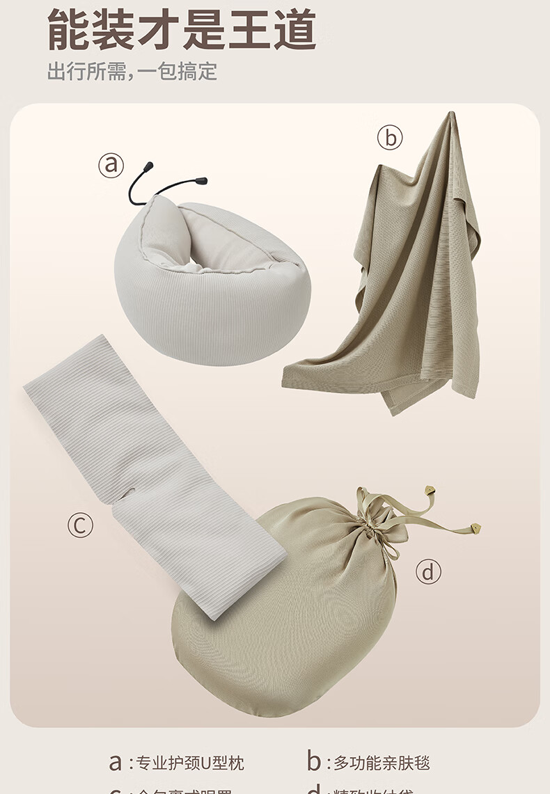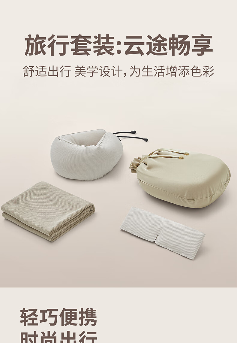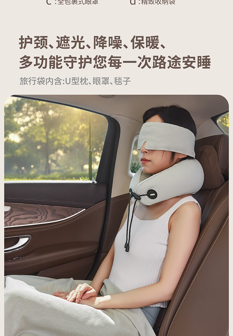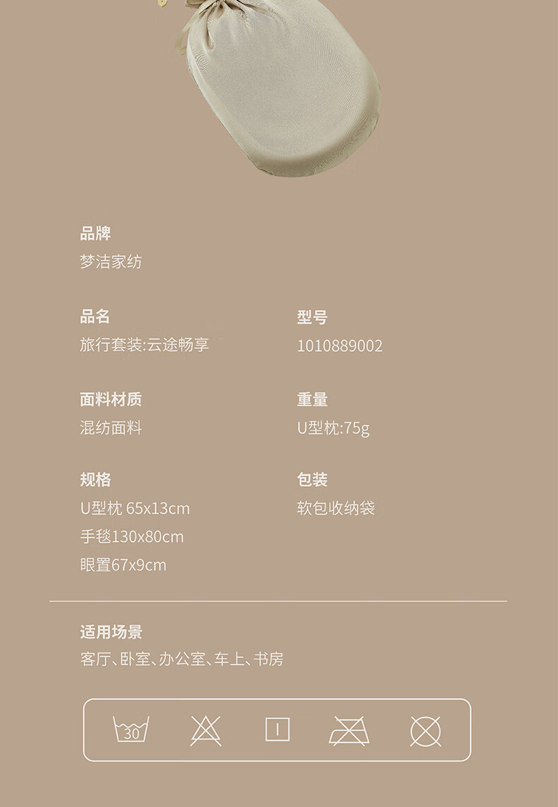 6 9 码:6909338277327 面 料:混纺面料 尺 寸: U型枕65*13cm 毛毯130*80cm 眼罩67*9cm 重 量:U型枕:75g 装 箱数:36套/件