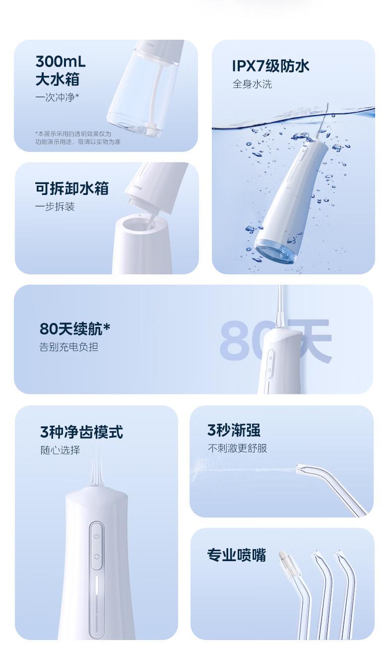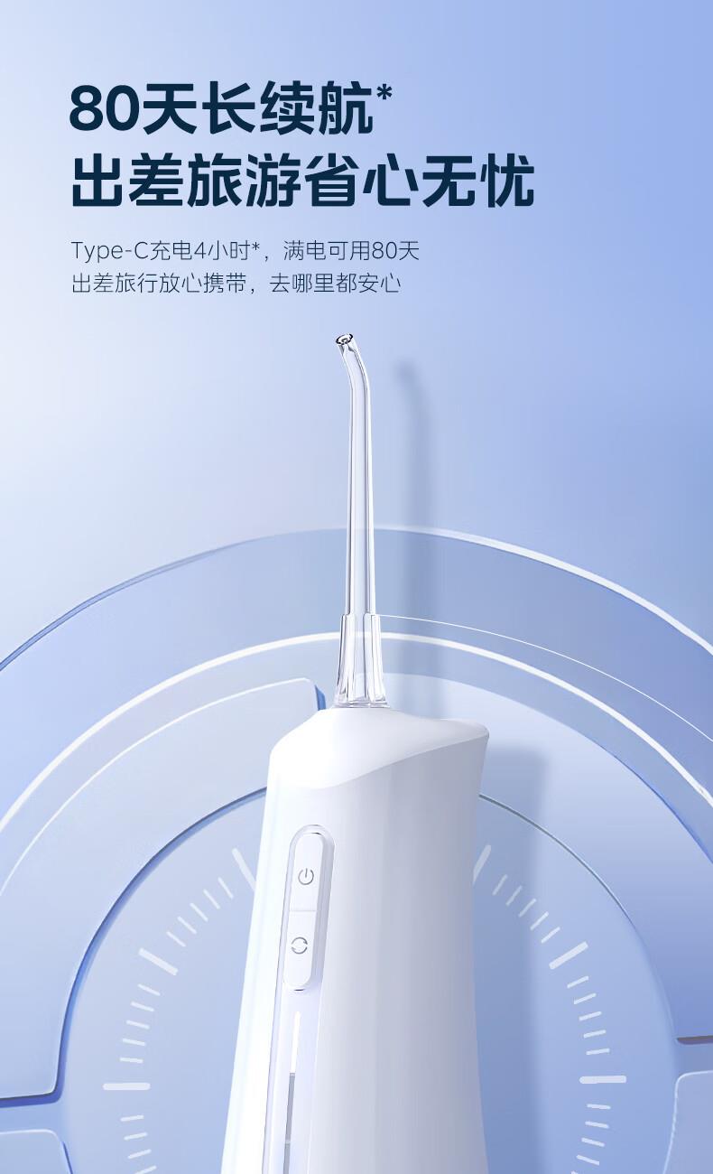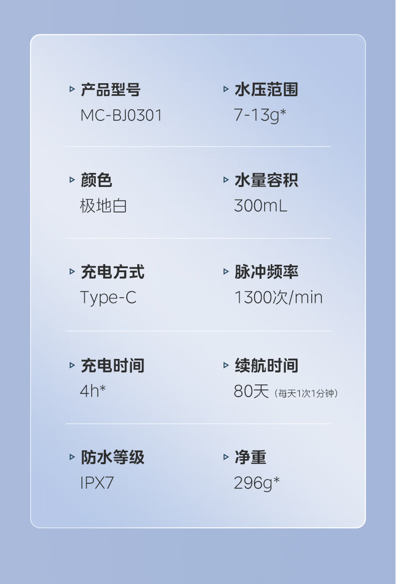 水压范围:40-135PSI颜色:极地白水量容积:300mL充电方式:Type-C脉冲频率:1300次/min充电时间:4h*续航时间:80天(每天1次1分钟)防水等级:IPX7 商品条形码:6973540202071 毛重:0.37 kg 包装尺寸:83 x 75 x 250 mm