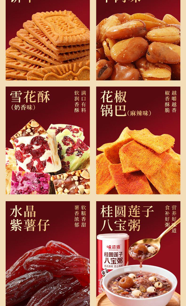 味滋源 夏威夷果 100g (红色款) 味滋源 熟核桃 100g (红色款) 味滋源 小白杏 100g (红色款) 味滋源 水晶紫薯仔红色款 150g 味滋源 新疆红枣 200g 味滋源 桂圆莲子八宝粥 320g 味滋源 炭烧腰果 100g (红色款) 味滋源 蒜香青豆 188g (红色款) 味滋源 兰花豆红色款 188g 味滋源 焦糖饼干 118g 味滋源 花椒锅巴158g(麻辣味) 味滋源 雪花酥(奶香味)125g 味滋源 巅紫坚果礼盒-手提绳外盒