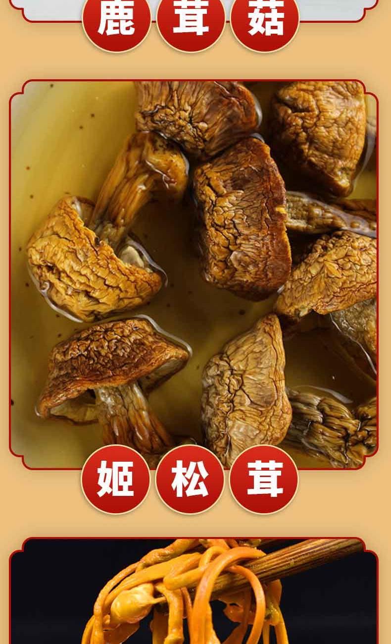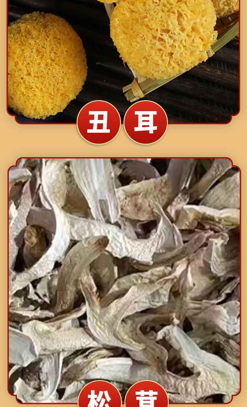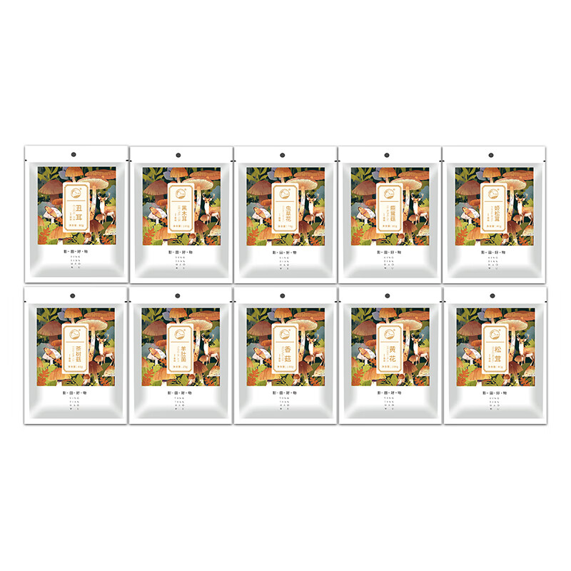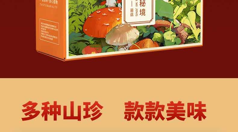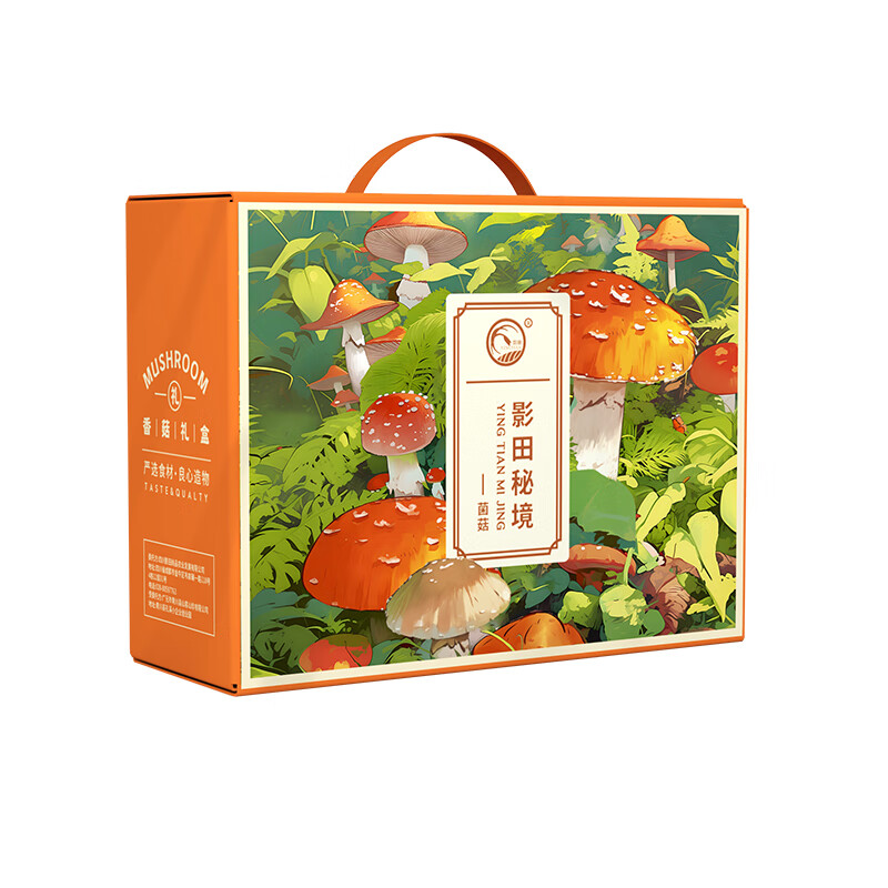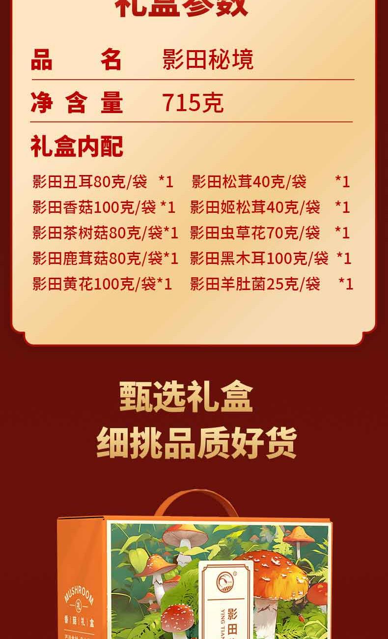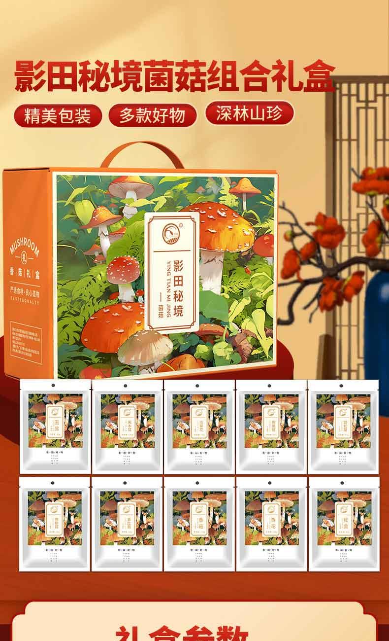 礼盒内配: 影田丑耳80g*1 影田松茸40g*1 影田黄花100g*1 影田香菇100g*1 影田羊肚菌25g*1 影田姬松茸40g*1 影田茶树菇80g*1 影田虫草花70g*1 影田鹿茸菇80g*1 影田黑木耳100g*1