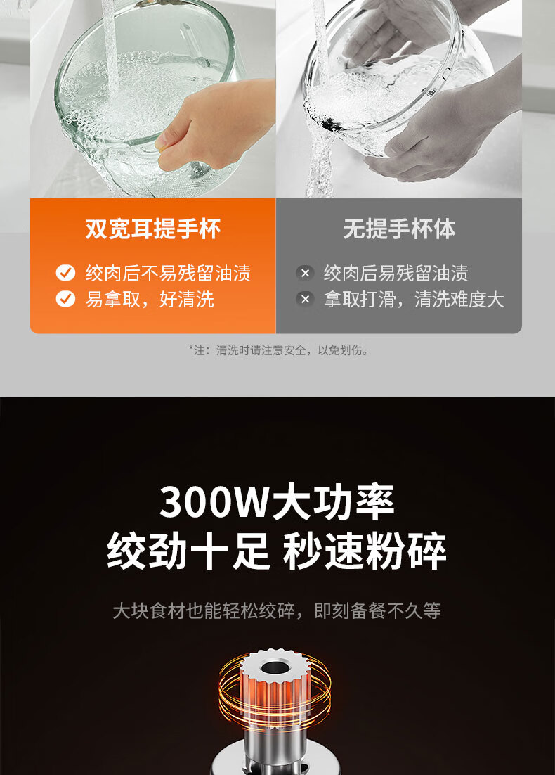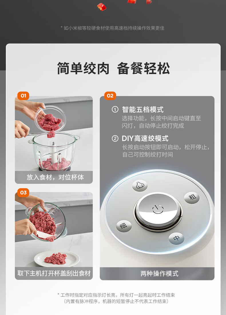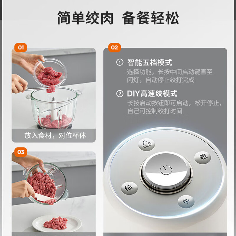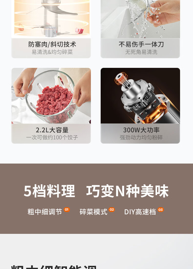 1、五档智能绞:粗肉粒、中肉粒、细肉粒、碎菜;DIY高速; 2、专 利防塞肉斜切一体刀,360度搅打无死角,不易伤手好清洗; 3、2.2L大容量可视玻璃杯 单次可绞肉500g; 4、300W大功率,强劲动力,秒速搅碎 容 量:2.2L 功 率:300W 装 箱:4台 /箱