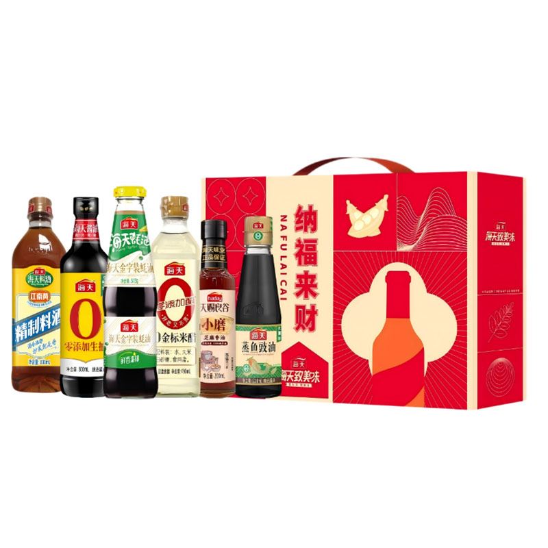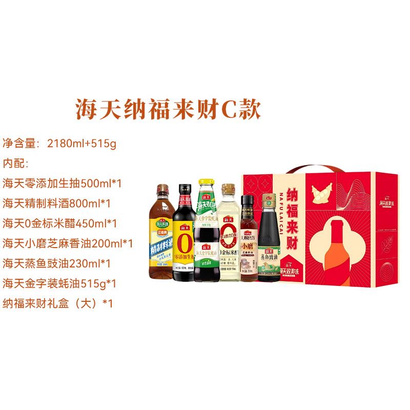 净含量:2180ml+515g 内配: 海天零添加生抽500ml*1 海天精制料酒800ml*1 海天0金 标米醋450ml*1 海天小磨芝麻香油200ml*1 海天蒸鱼豉油230ml*1 海天金字装蚝油515g*1 纳福来财礼盒(大)*1