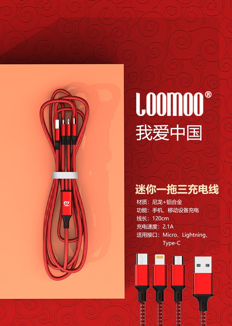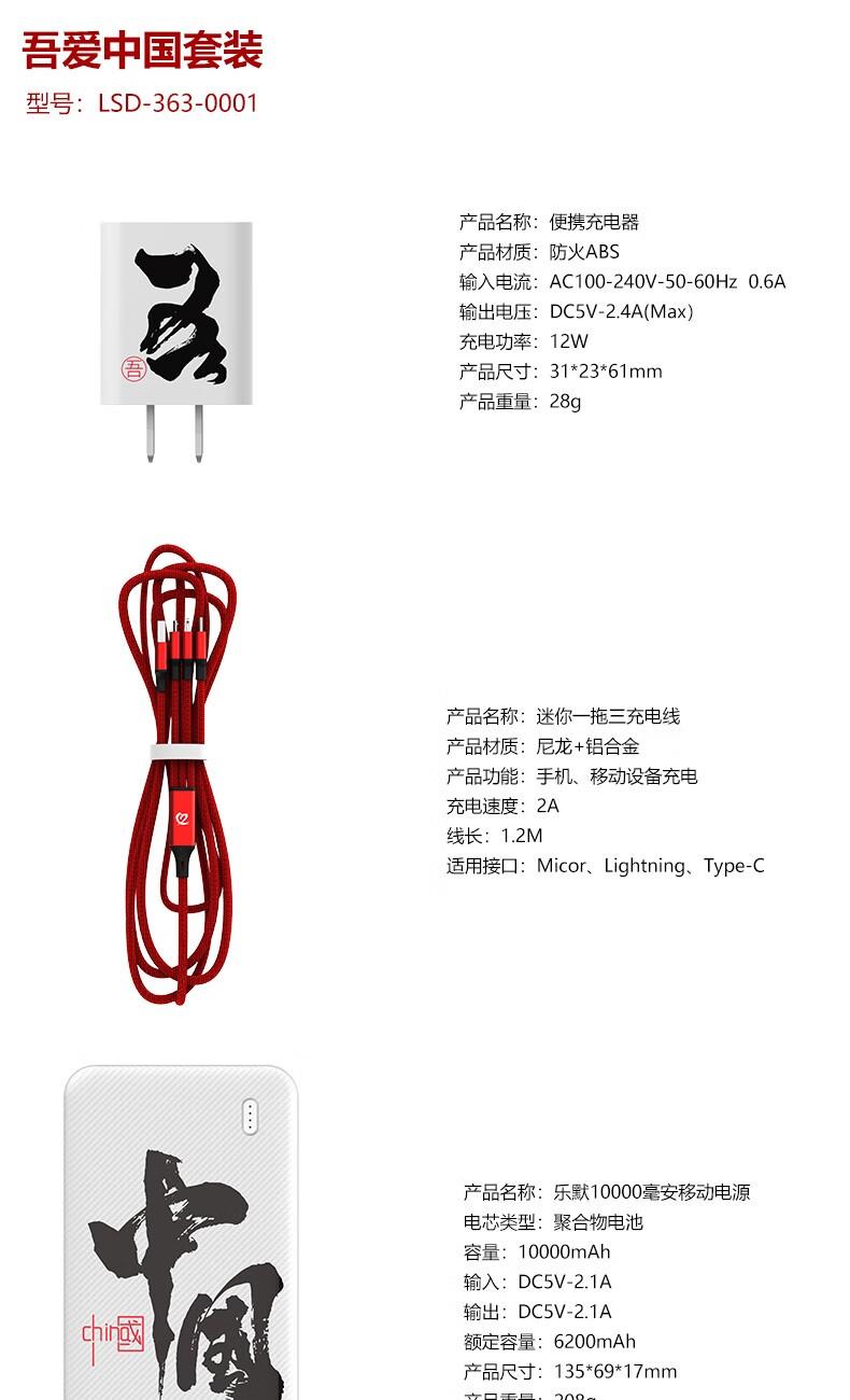 型号:LDS-363-0001 数据线:产品材质:尼龙+铝合金, 充电器:材质:防火ABS 产品功能:手机、移动设备充电 输入:AC100-240V-50-60Hz 0.6A 适用接口:Lightning/Micro/Type-C 输出:DC5V-2.4A(Max) 充电速度:2.A 长度:1.2米 功率:12W 移动电源:电芯容量:10000毫安 电池类型:锂聚合物电池 外观材质:防火级ABS 表层布纹 输入:2A 输出:2.1A 智能分配
