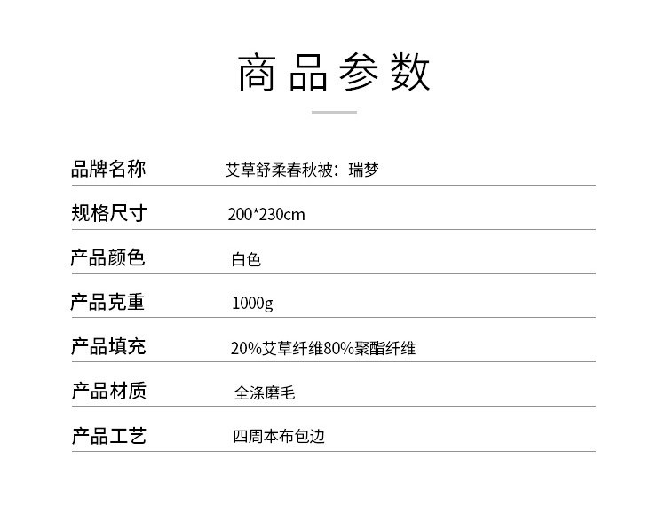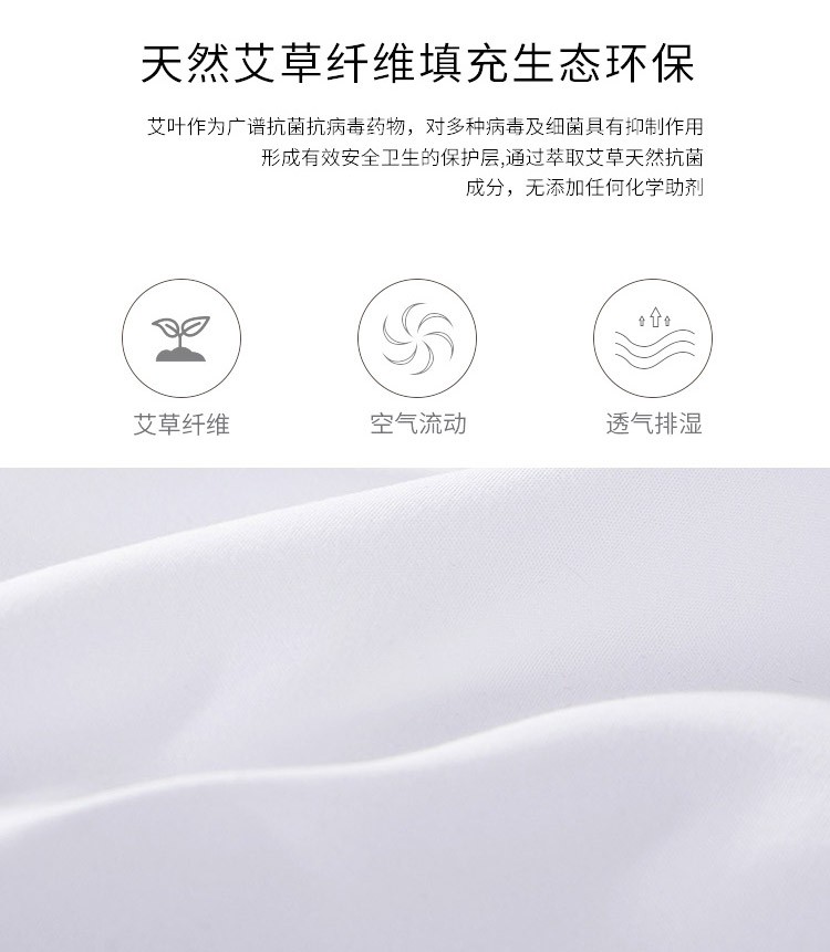 型号:1010289055 规格:200*230cm 面料:聚酯纤维 填充物:艾草纤维+聚酯纤维 克重:1000g 包装:超声波无纺布袋 条形码:6909338181976