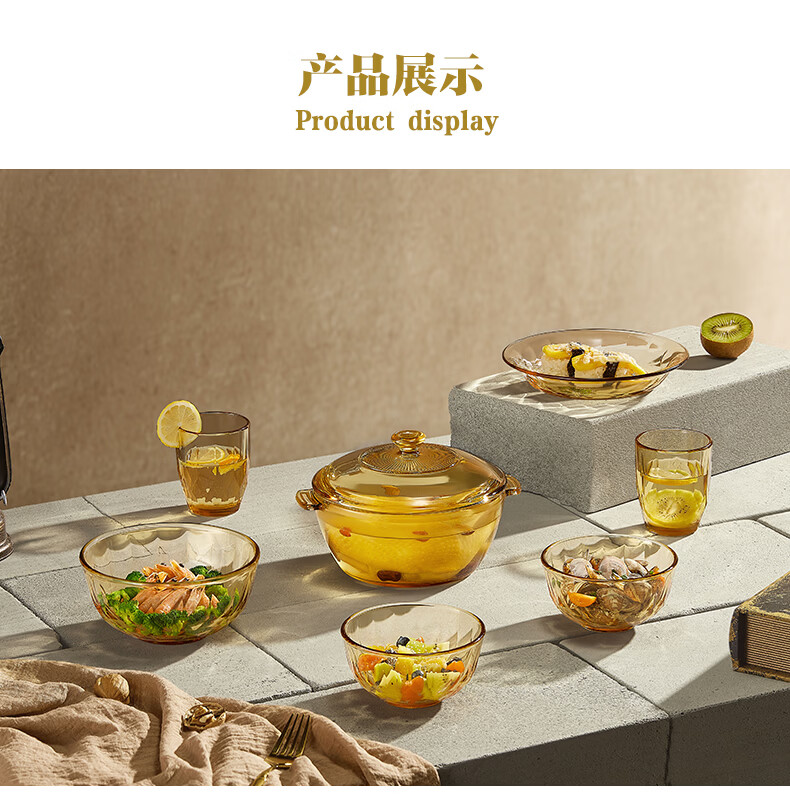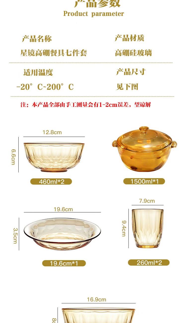 装 箱 规格:4套 /箱适用温度:-20°C-200°C材 质:高硼硅玻璃产品参数:小碗460ml*2、 盘196mm*1、高硼煲*1、大碗*1、水杯*2 彩盒尺寸:413*112*346mm 外箱尺寸:46.8*42.7*36.2cm