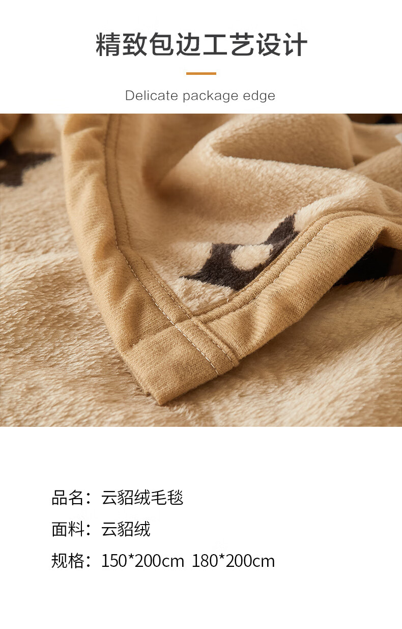 面 料: 云貂绒 重 量: 700g 规 格: 150*200cm 包 装: 手提盒