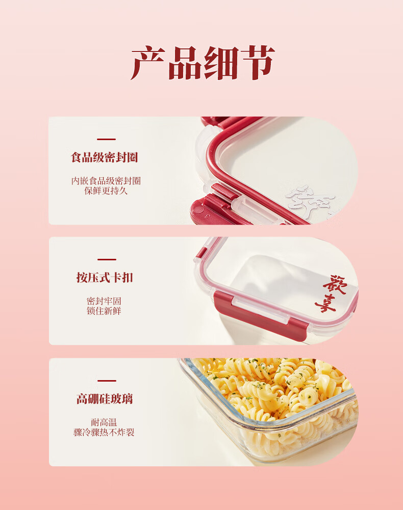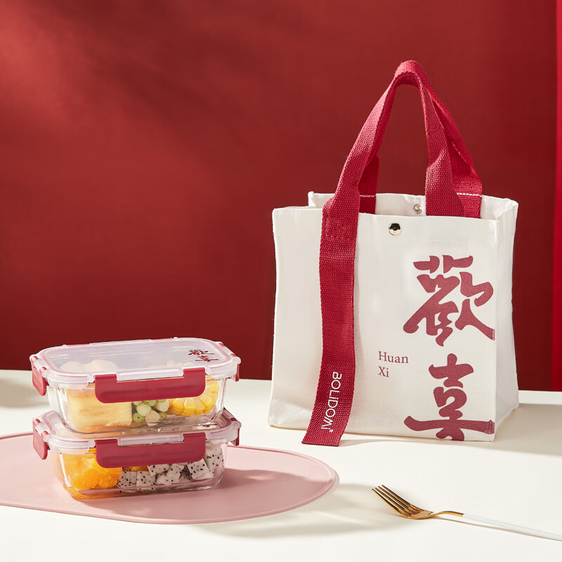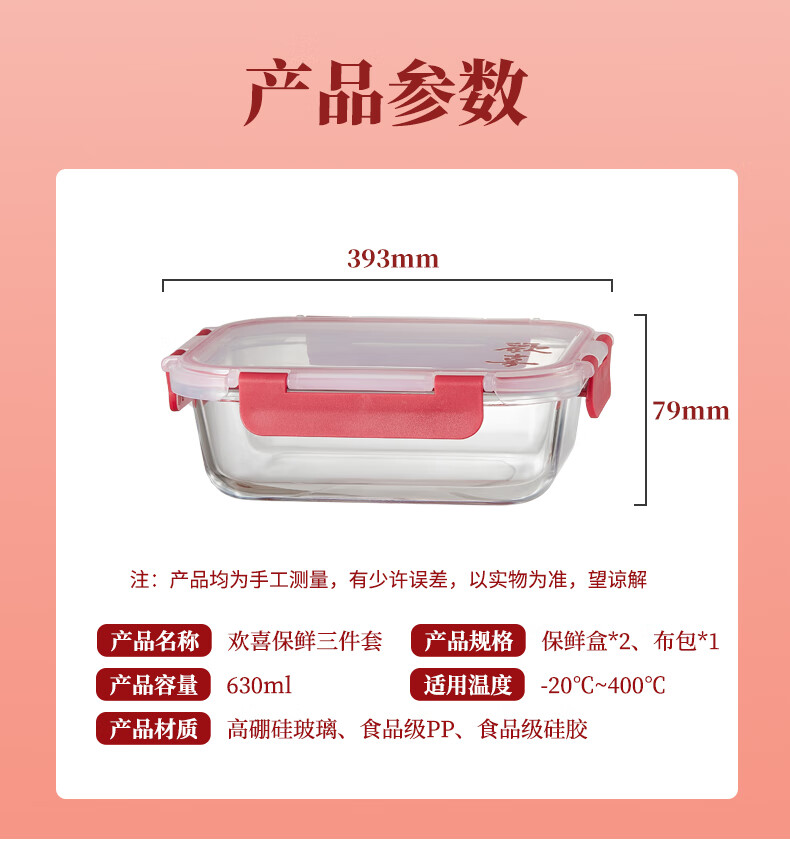 【规格】:10套 /箱 【组合】中长保鲜盒630ml*2、布包*1 【材质】:高硼硅玻璃-20~400℃、食品级PP、食品级硅胶 【彩盒尺寸】:365*248*83mm 【外箱尺寸】:43.7*37.9*51.4CM 【毛重】:15kg