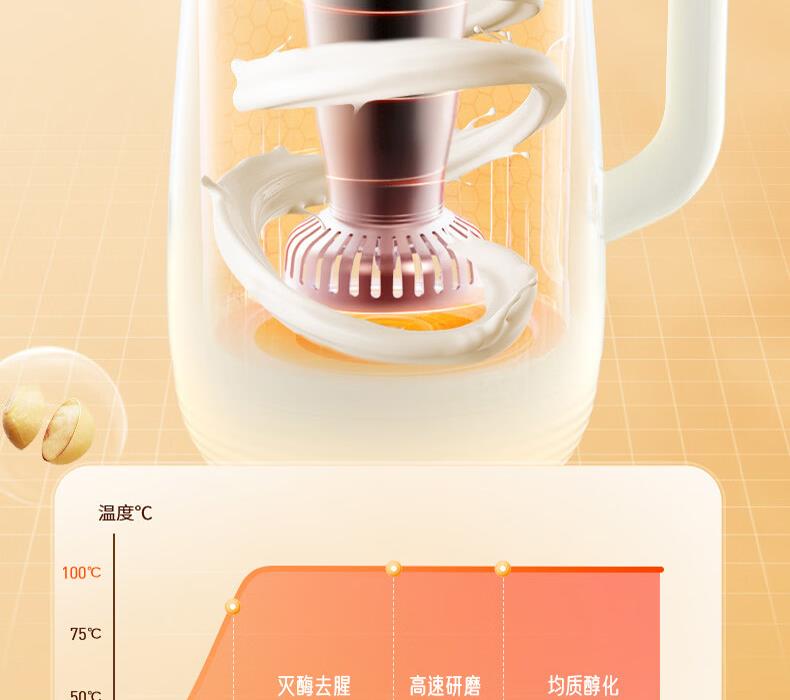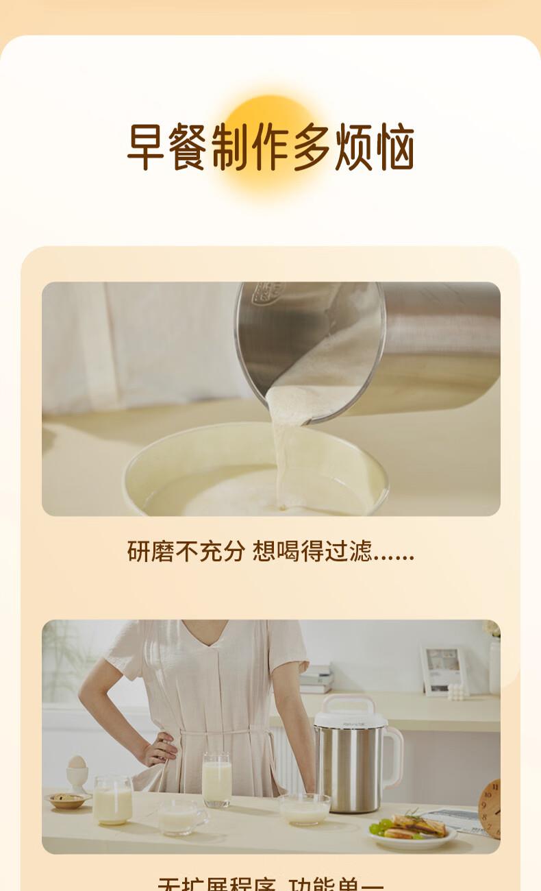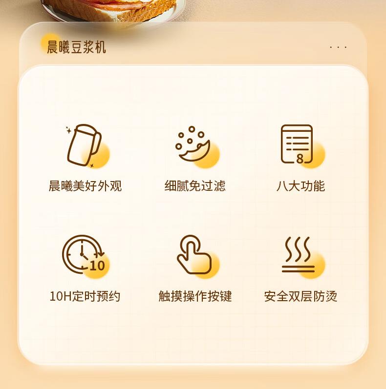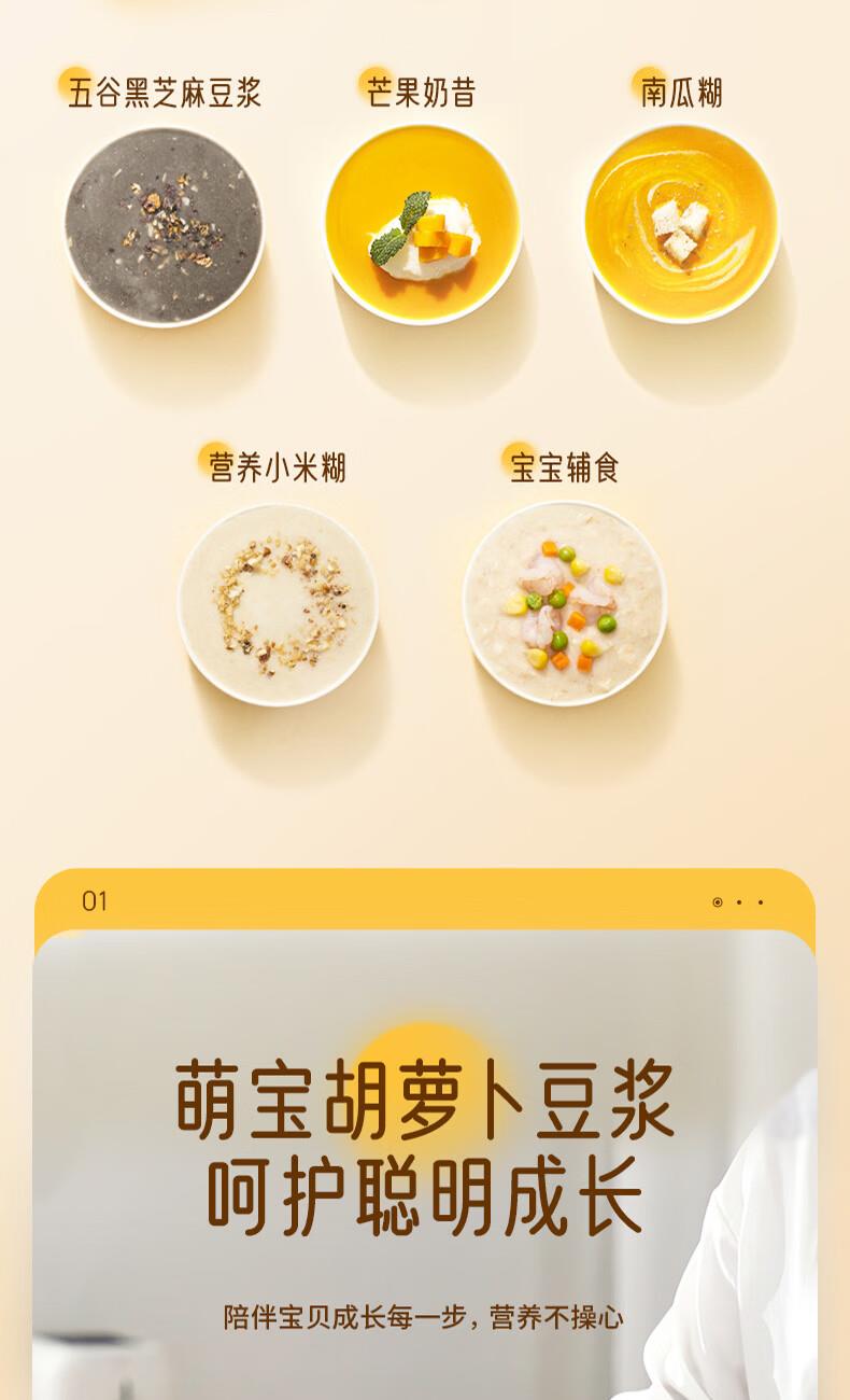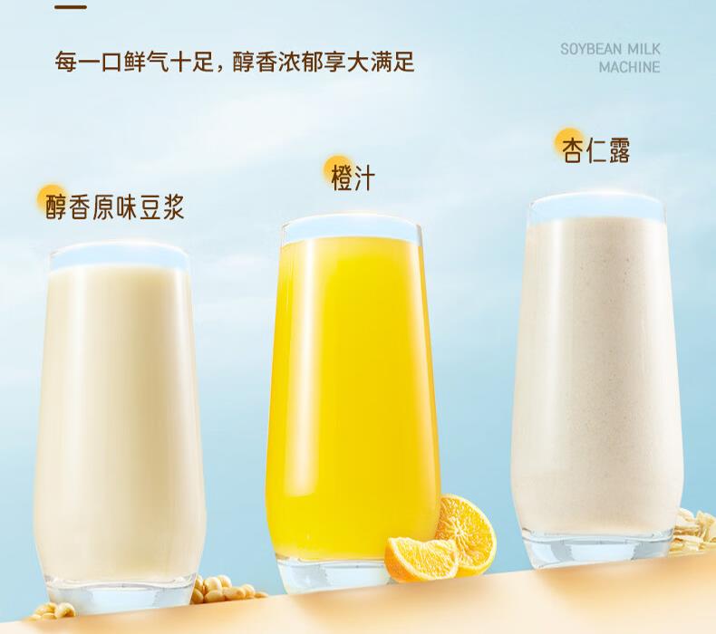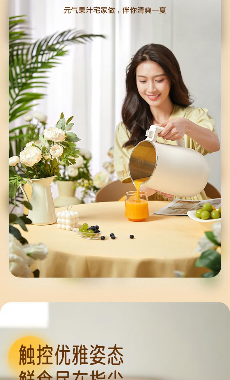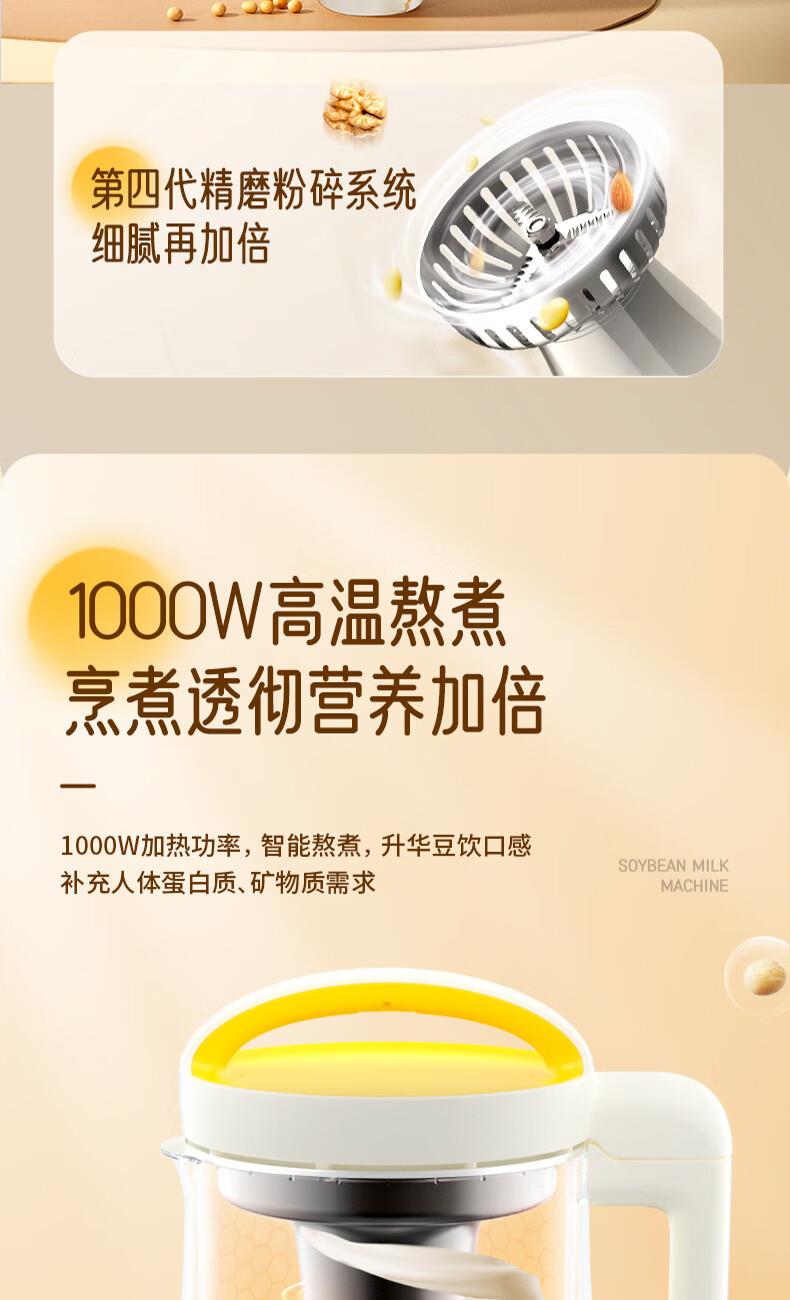 1、免滤细腻、8大功能,1.2L容量满足一家3口、 2、触摸按键操作便捷 ,10小时定时预约 3、10小时定制预约 4、1000-1200ML容量,任意选择 5、豆浆/米糊/果汁/奶茶/辅食 6、意式简洁造型设计,双层防烫304不锈钢