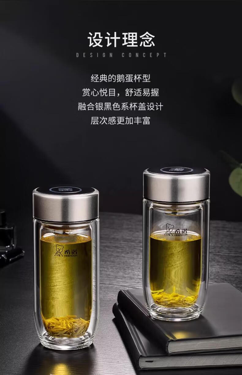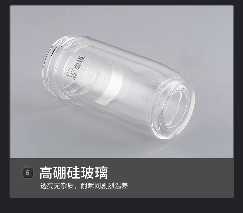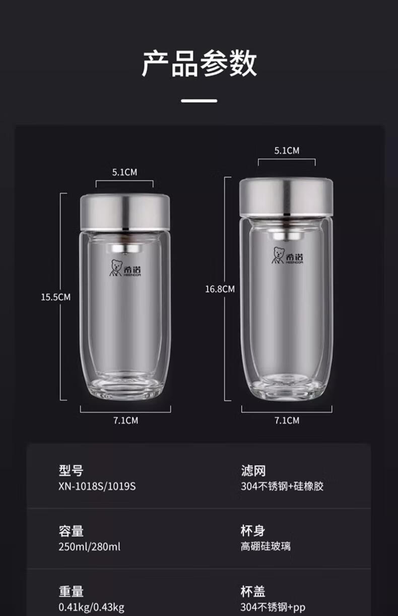 容量 XN-1019S:280ml 规格(mm) XN-1019S:51(杯口直径)x71(直径)x168(高度) 杯体 双层高硼硅玻璃 杯盖 进口食品级PP、304不锈钢 滤网 304不锈钢、进口食品级硅胶 密封圈 进口食品级硅胶 重量 XN-1019S:0.43kg 颜色 珠光本色