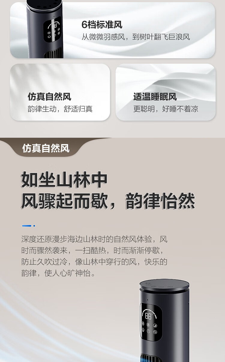 额定电压:220V~ 额定频率:50Hz 额定功率:50W 净重:3.30kg 毛重:4.25kg 档位:6档标准风+自然风+睡眠风 摆头角度:左右60度摆头 控制方式:触摸键+遥控 包装尺寸:1020x200x210mm