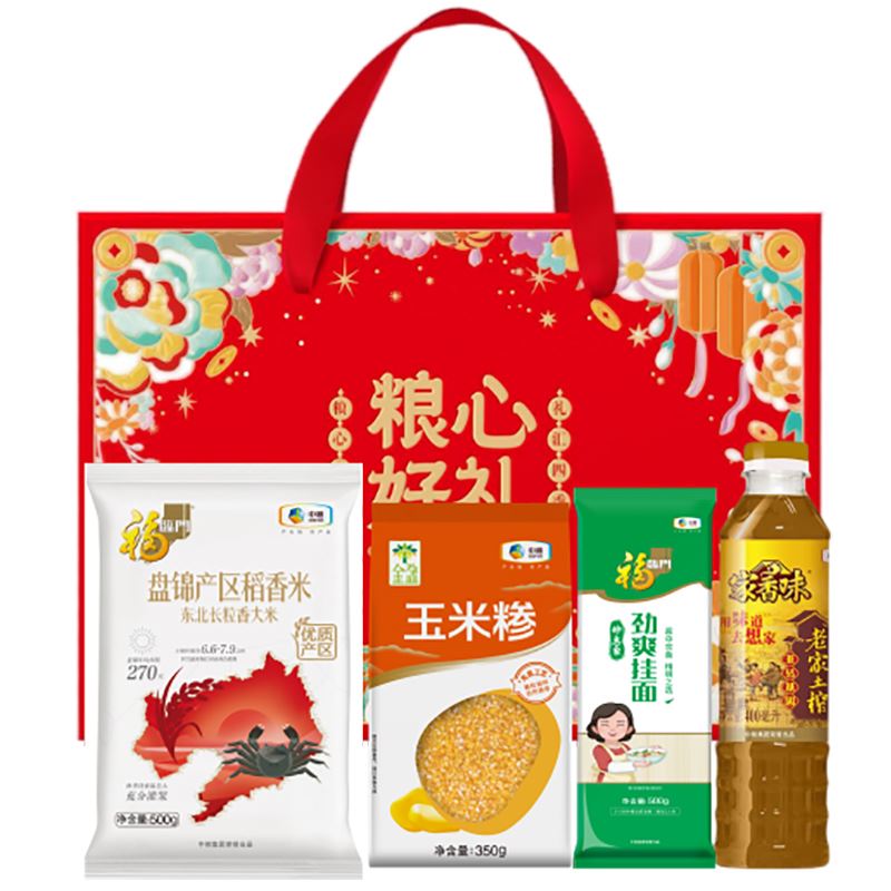 净含量:1350g+400ml 中粮福临门盘锦长粒香米500g 中粮金盈玉米糁350g 中粮福临门妙惠家挂面500g 中粮福临门老家土榨菜籽油400ml