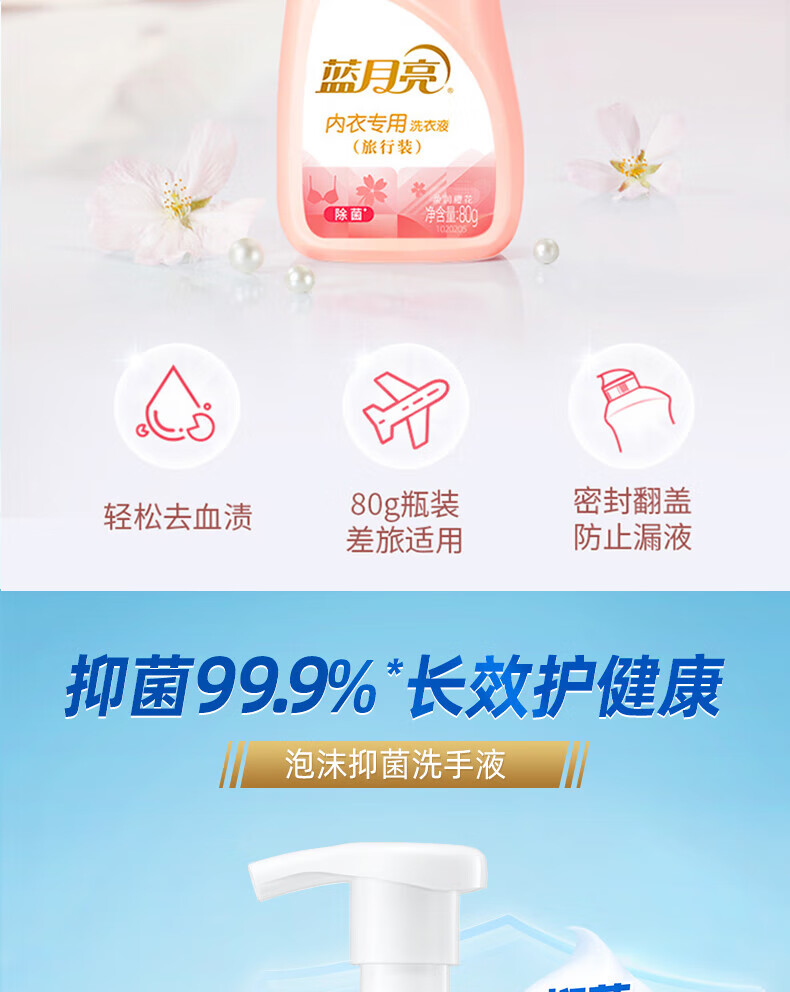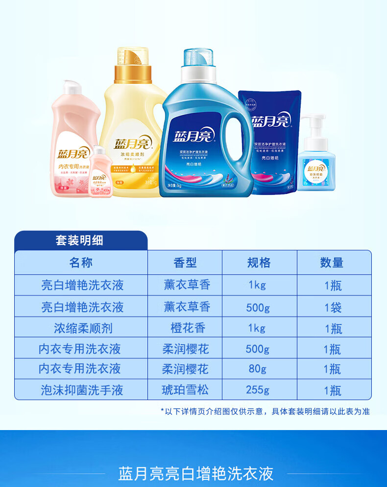 亮白增艳洗衣液瓶-薰衣草1kg*1 亮白增艳洗衣液袋装-薰衣草500g*1 浓缩除 菌柔顺剂-橙花1kg*1 内衣专用洗衣液翻盖-柔润樱花500g*1 泡沫抑 菌洗手液-琥珀雪松255ml*1 内衣专用洗衣液旅行装-柔润樱花80g*1