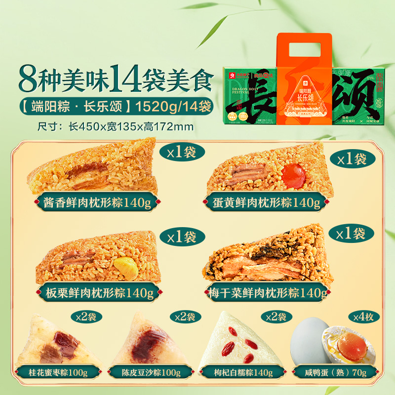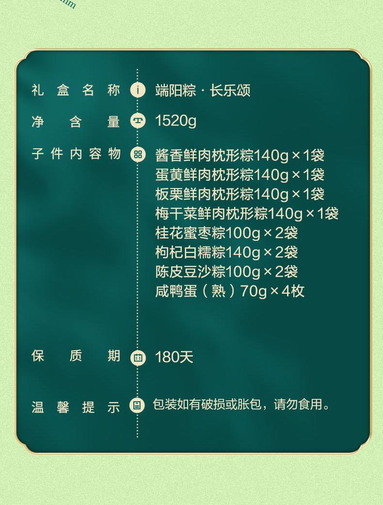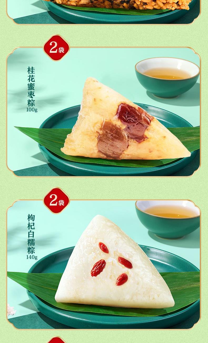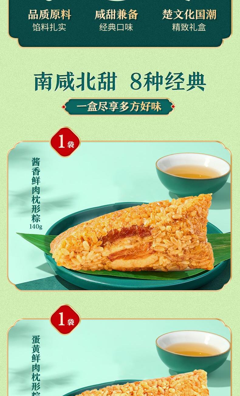 酱香鲜肉枕形粽140g*1 蛋黄鲜肉枕形粽140g*1 板栗鲜肉枕形粽140g*1 梅干菜鲜肉枕形粽140g*1 桂花蜜枣粽100g*2 枸杞白糯粽140g*2 陈皮豆沙粽100g*2 咸鸭蛋(熟)70g*4