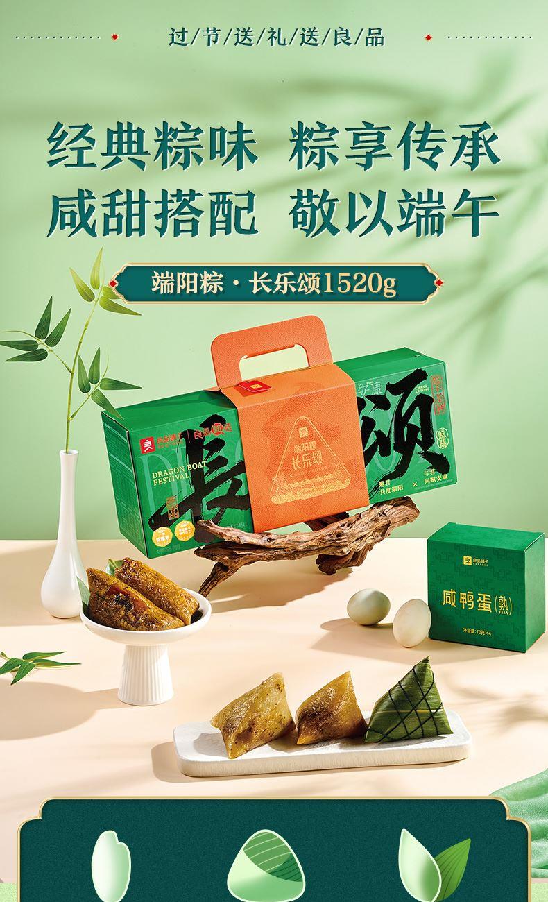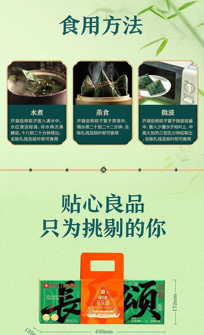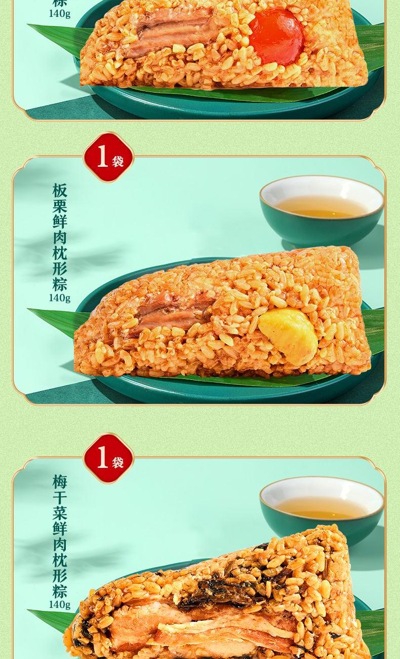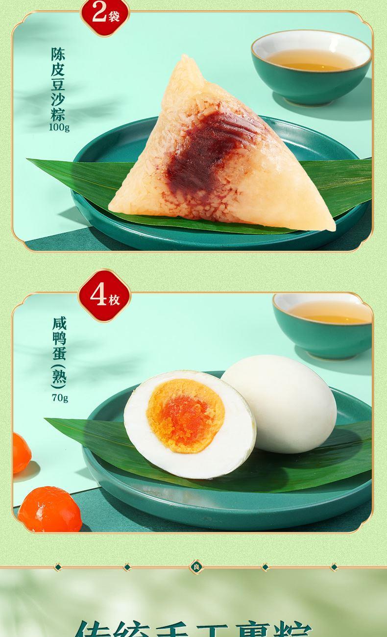 酱香鲜肉枕形粽140g*1 蛋黄鲜肉枕形粽140g*1 板栗鲜肉枕形粽140g*1 梅干菜鲜肉枕形粽140g*1 桂花蜜枣粽100g*2 枸杞白糯粽140g*2 陈皮豆沙粽100g*2 咸鸭蛋(熟)70g*4