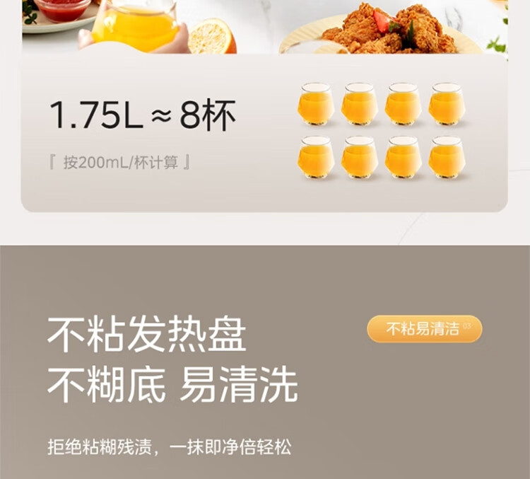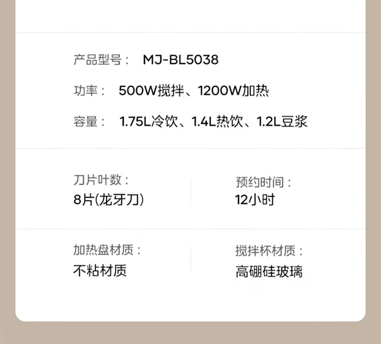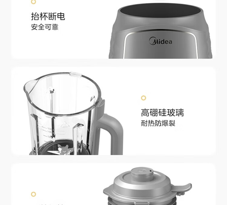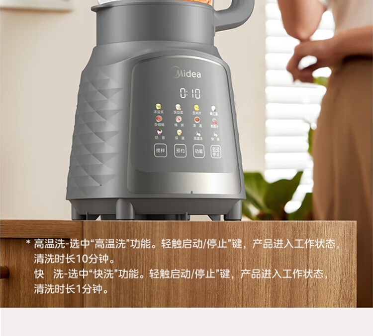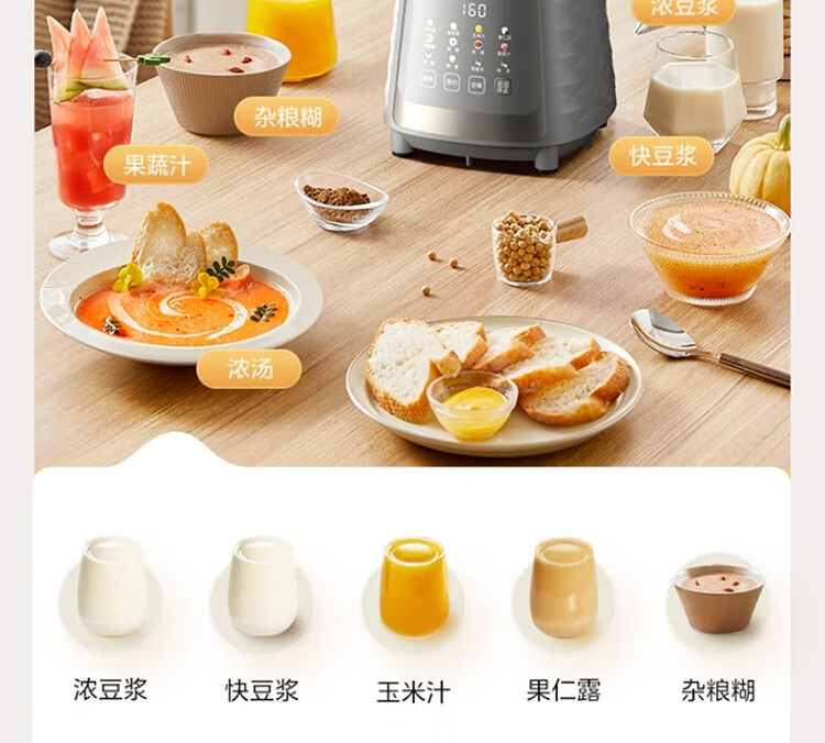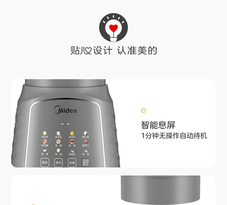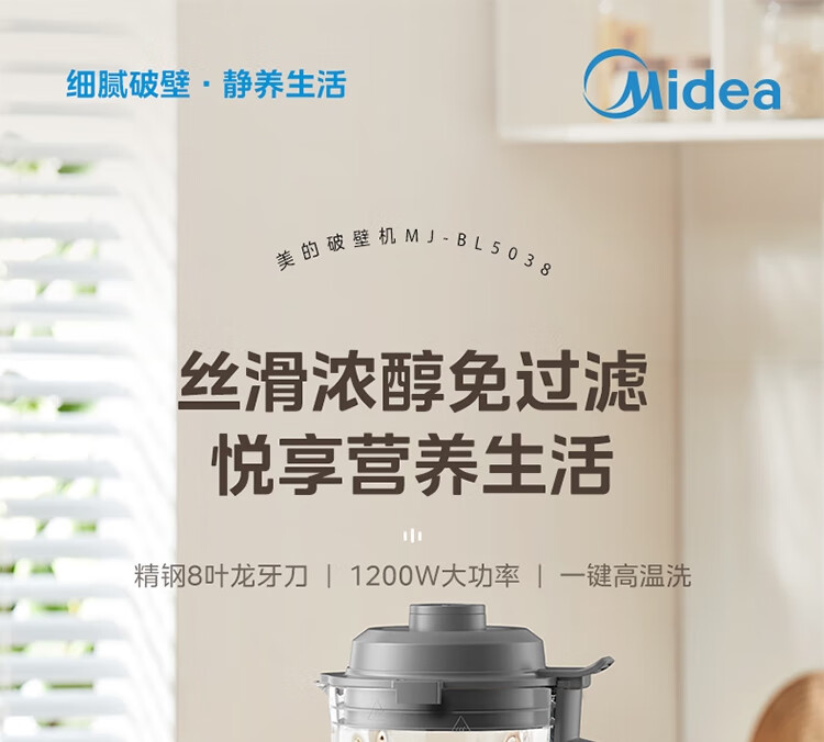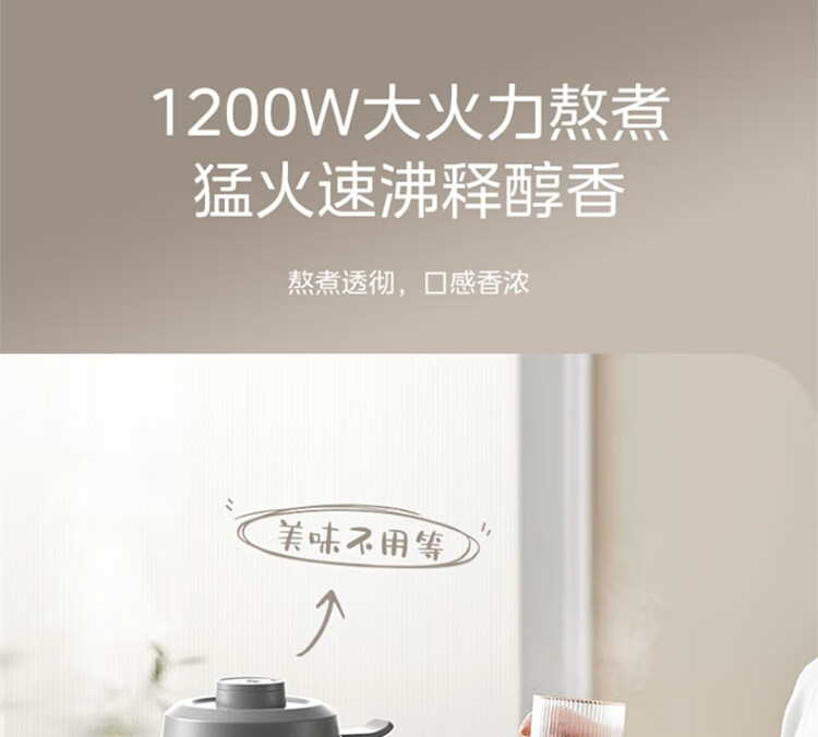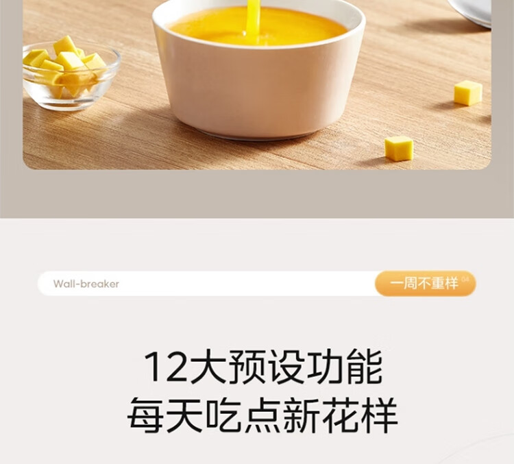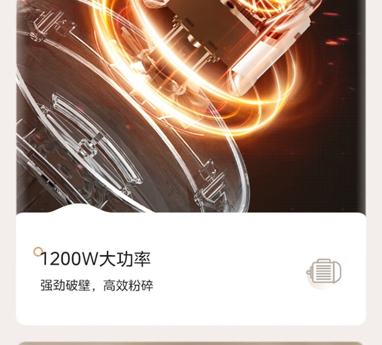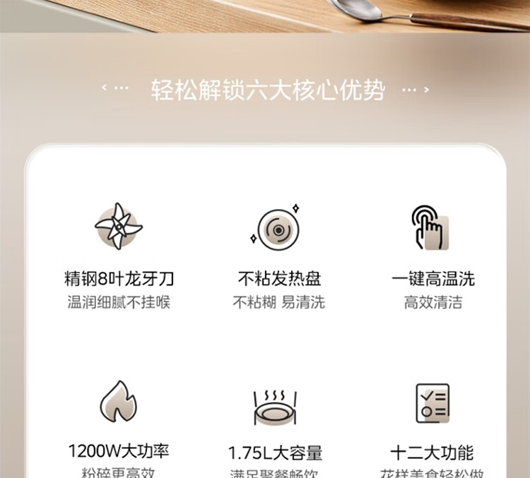 1.12大功能,花样美食不重样2.1200W加热功率,大火力快速加热;3.陶瓷不粘发热盘,易清洗8叶精钢锯齿破壁刀,高效细腻破壁4.500W搅拌,快速搅打双洗模式,多重清洁