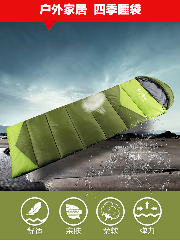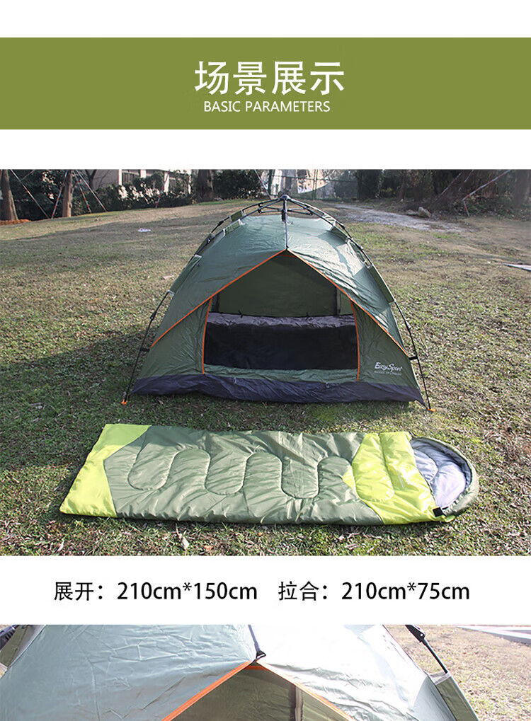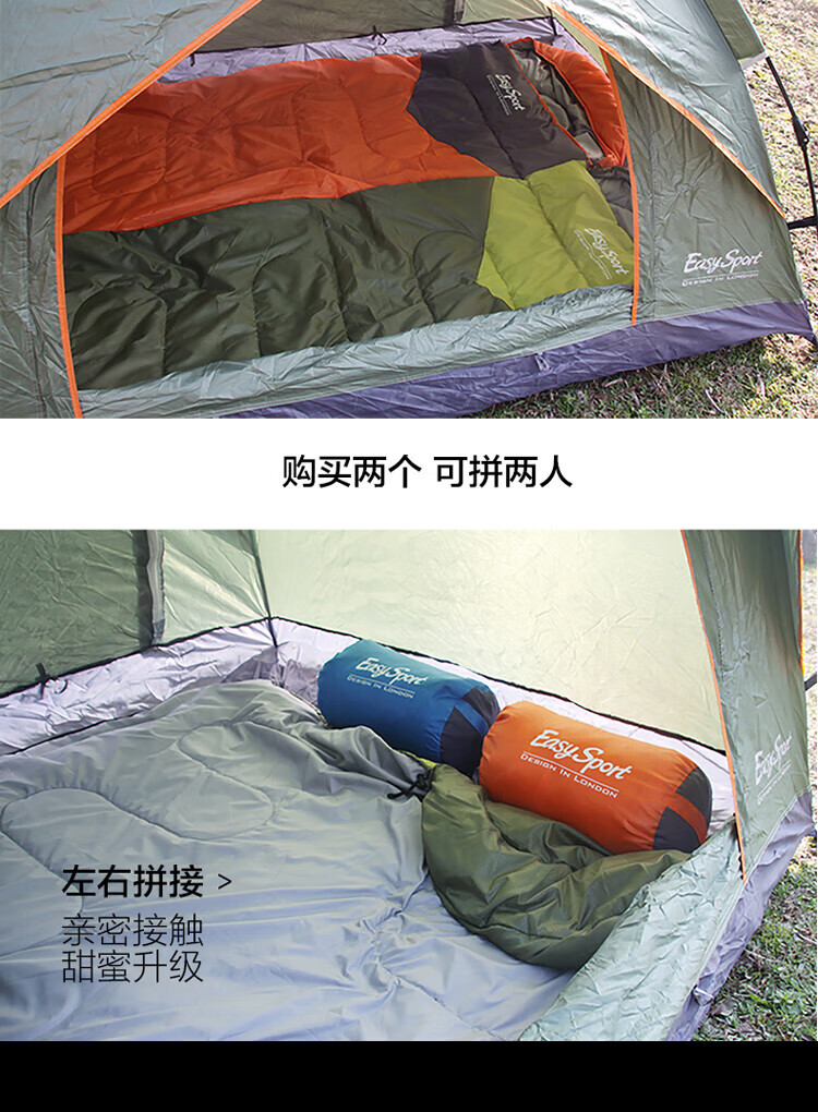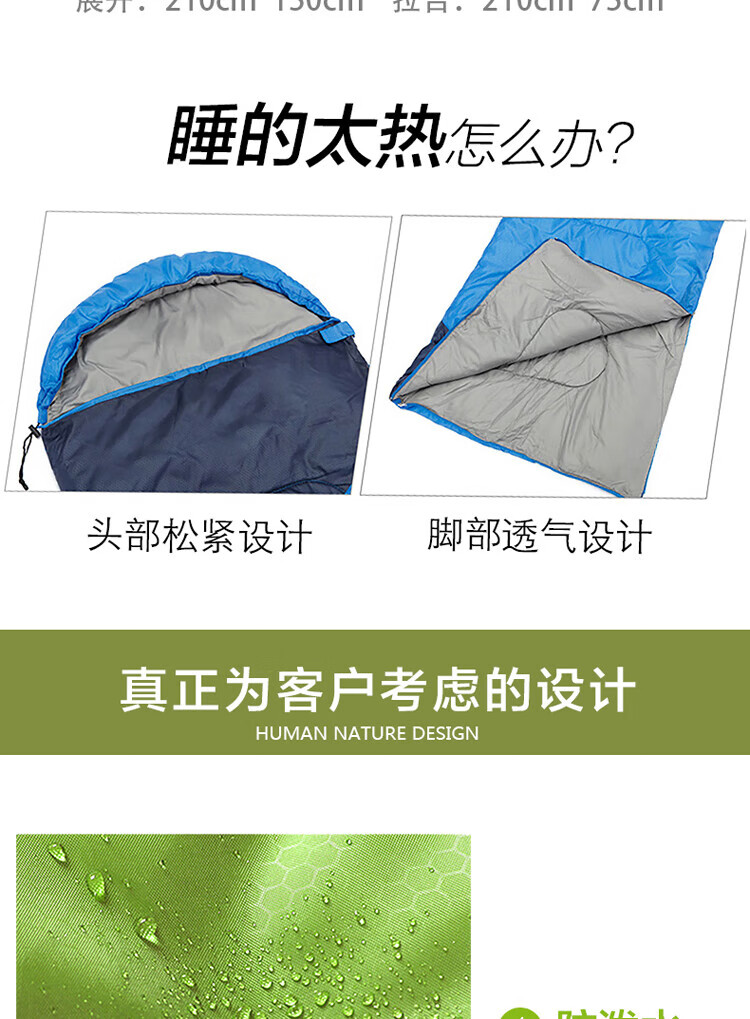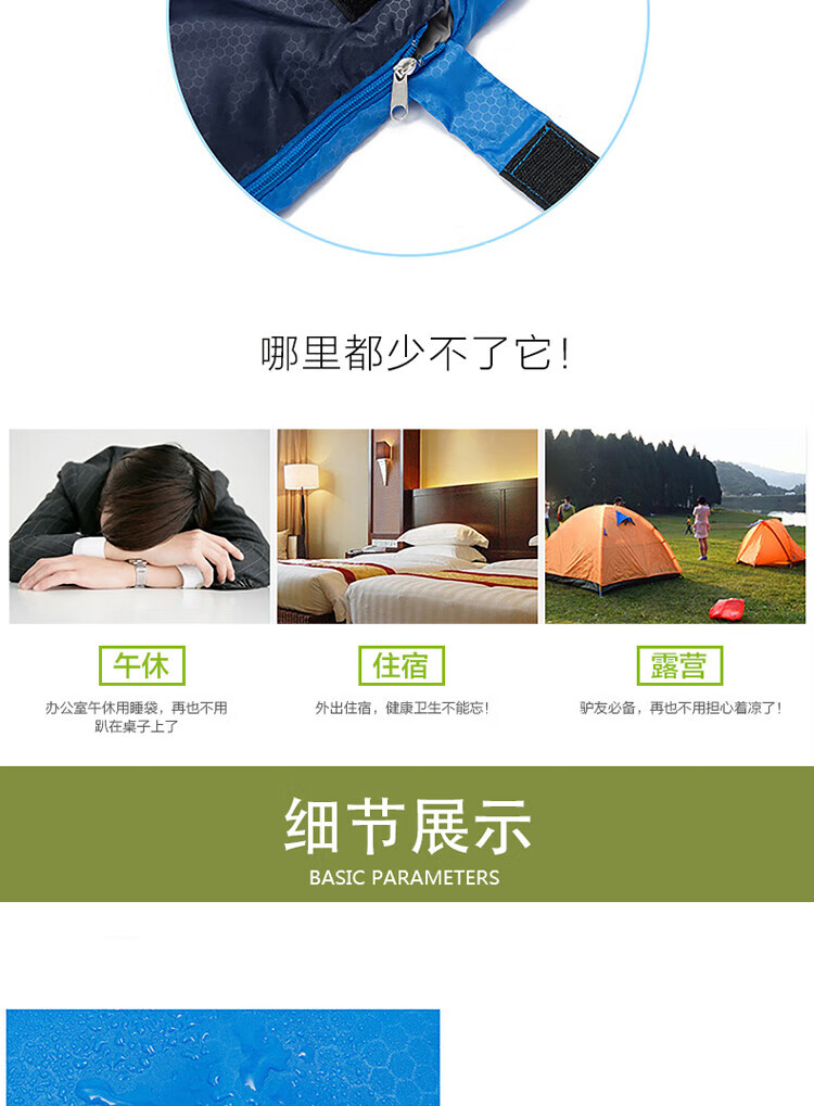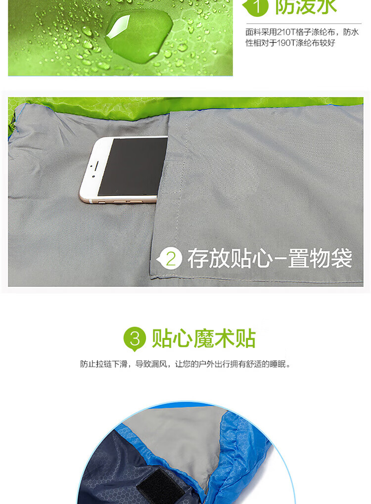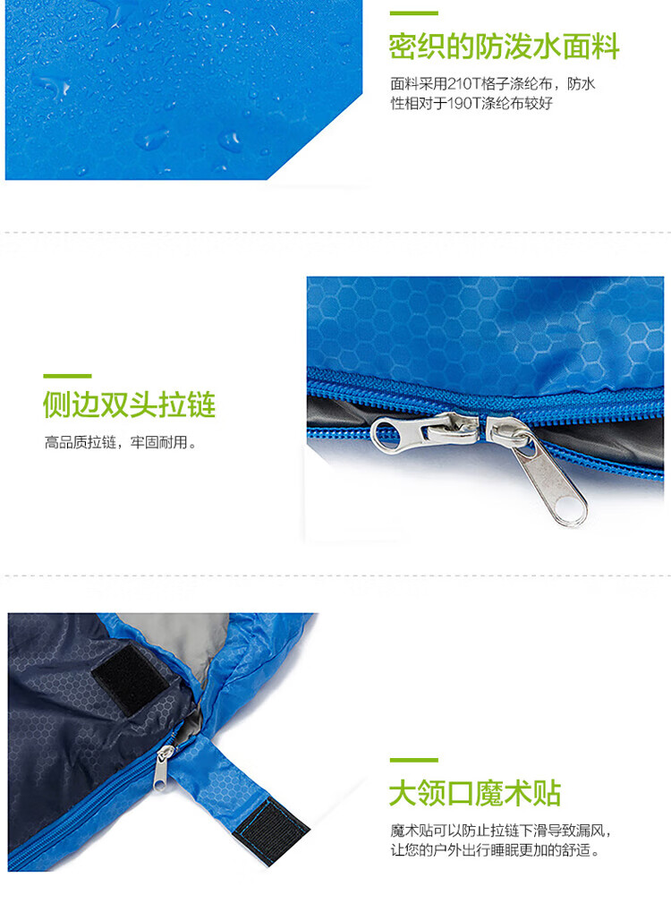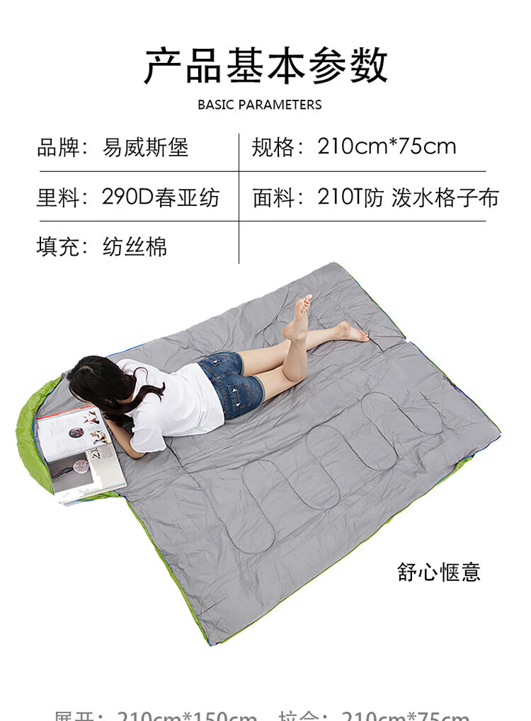 装 箱:10个 /箱 规格:睡袋:210*75CM 展开:210*150CM 重量:1.12KG 材质:面料:190T格子涤丝纺印花 里料:210T春亚纺 填充物:优质中空棉