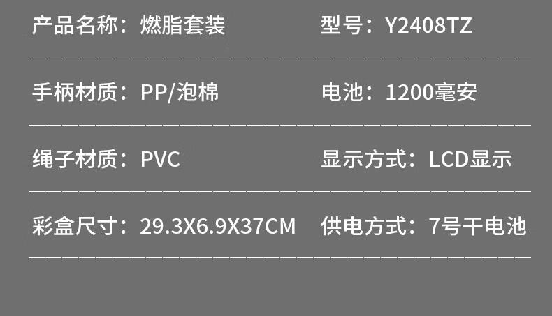 转速:1500-2800 手柄材质:PP/泡棉 电池:1200毫安 绳子材质:PVC 大功率:18W 供电方式:7号干电池 显示方式:LCD显示
