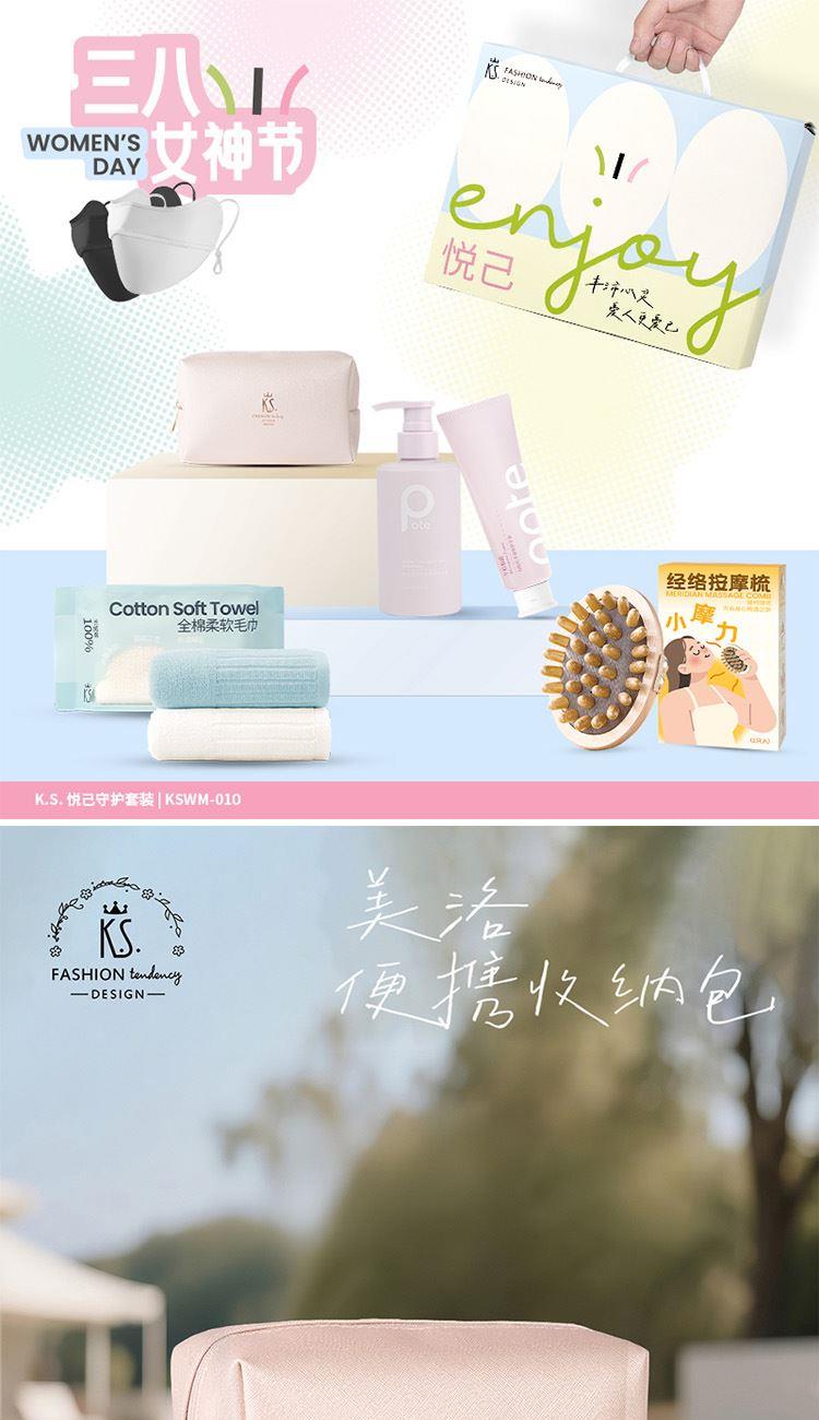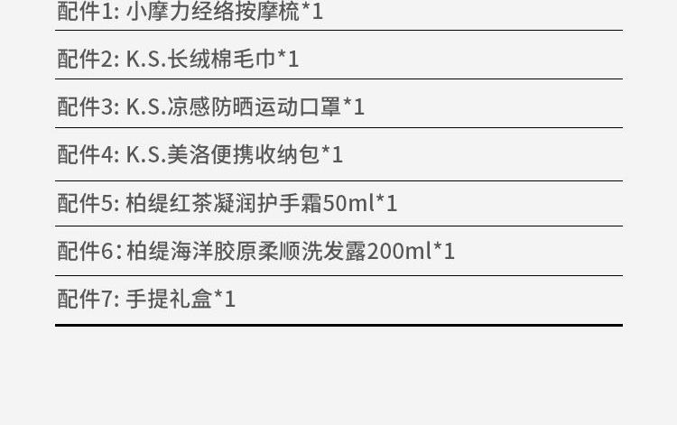 礼盒配置 1.小摩力经络按摩梳*1 2.K.S.长绒棉毛巾*1 3.K.S.凉感防晒运动口罩(KS-1095)*1 4.K.S.美洛便携收纳包*1 5.柏缇红茶凝润护手霜50ml*1 6.柏缇柏缇元气桃桃沐浴露200ML*1 7.手提礼盒*1 彩盒尺寸: 210*285*113mm 装 箱数:12pcs