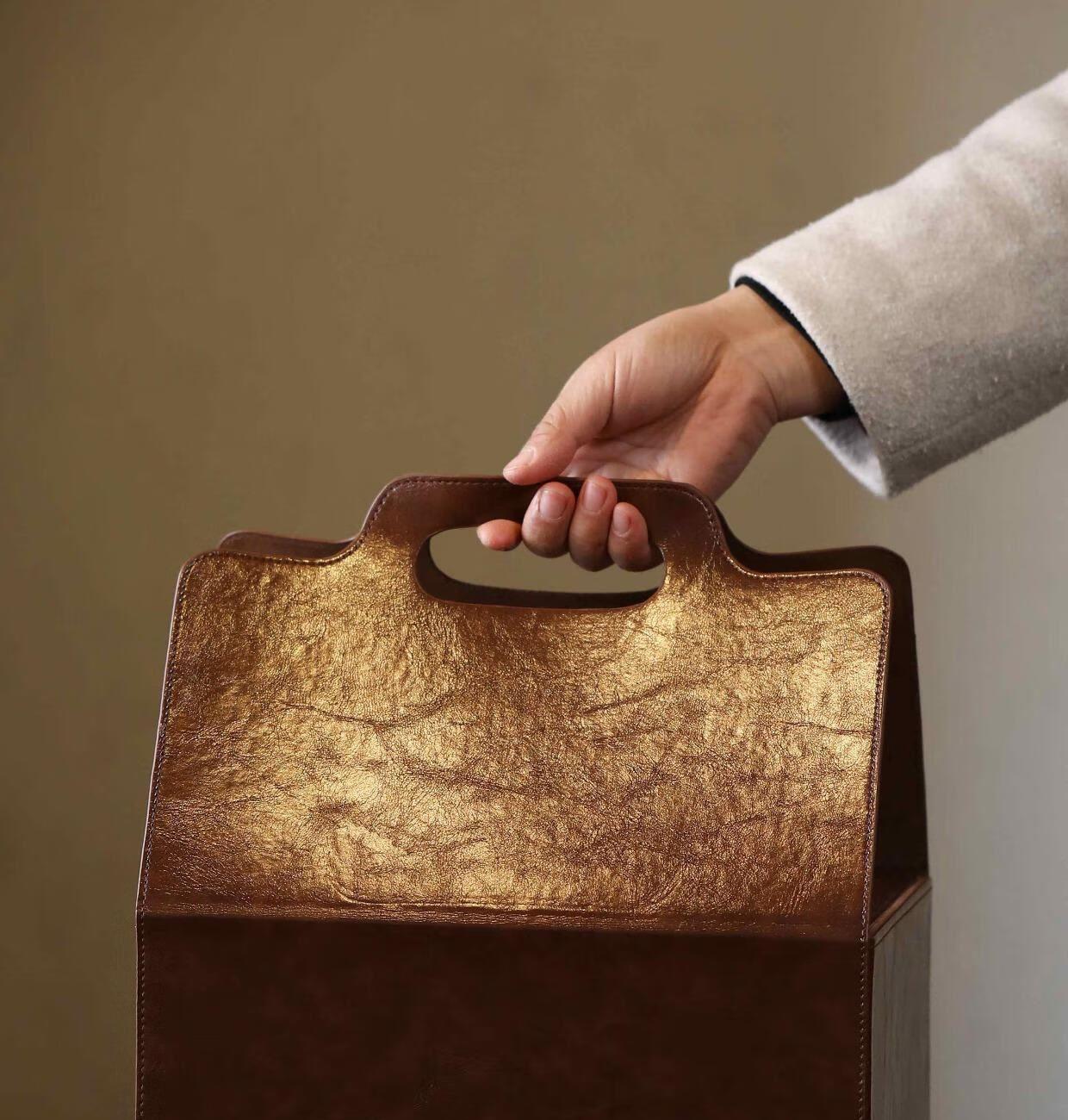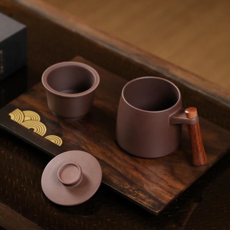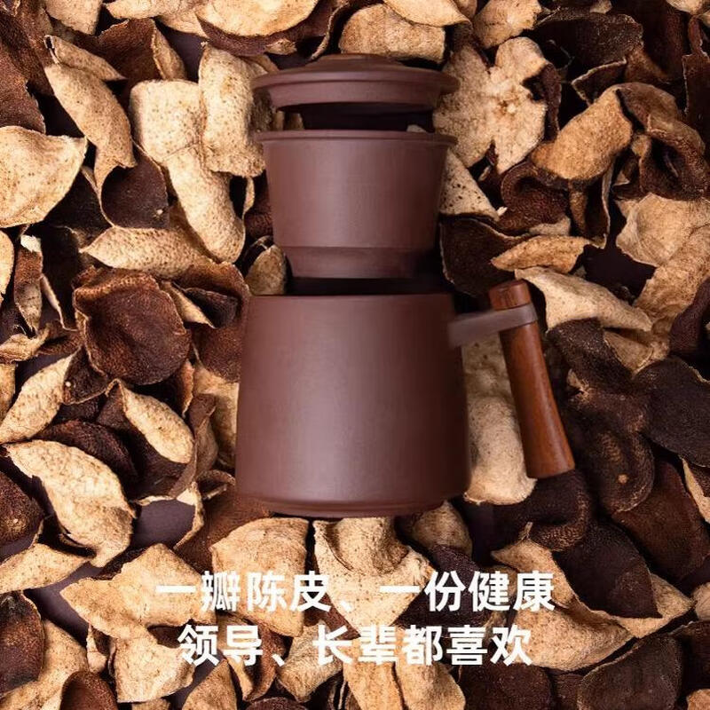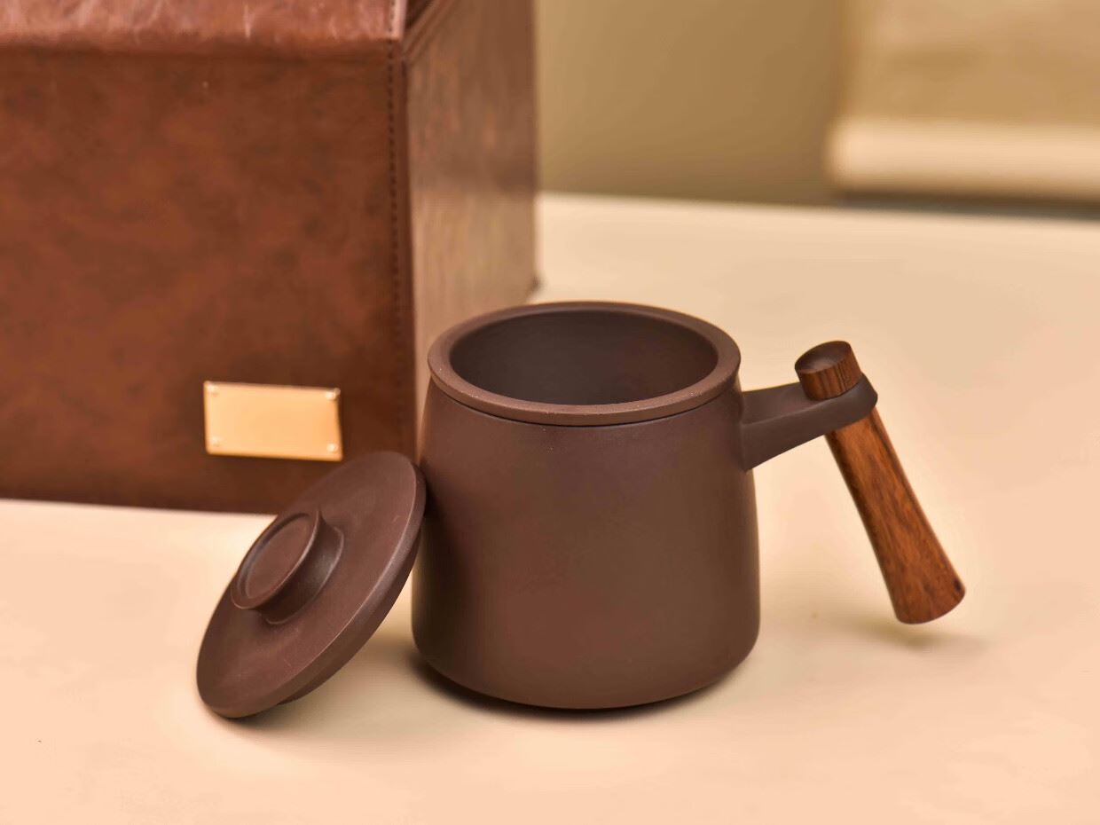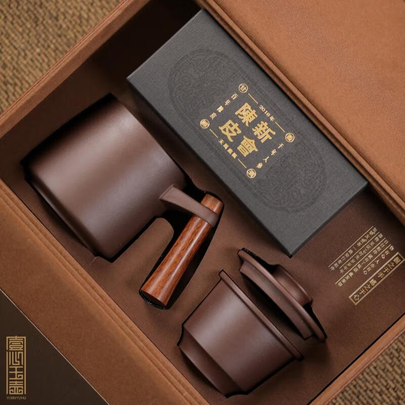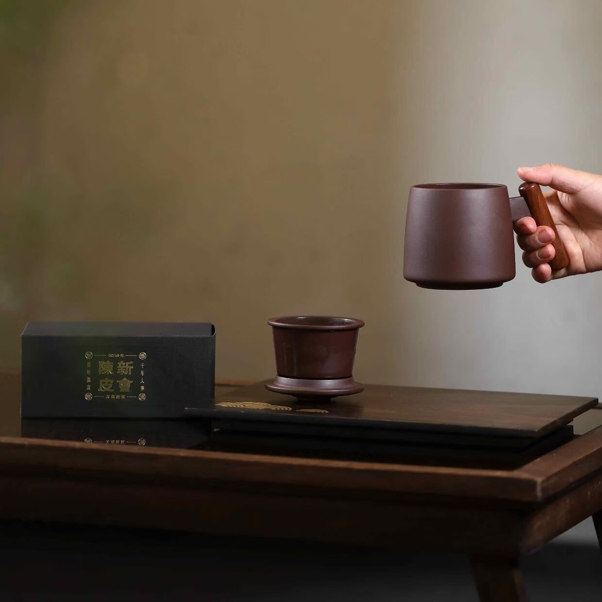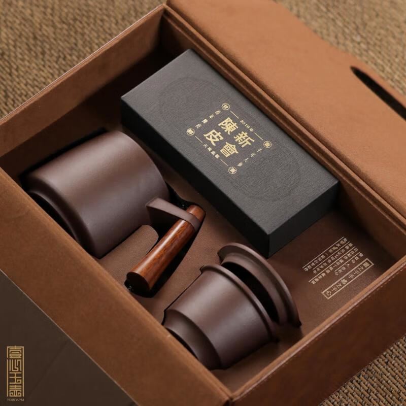 ①知行·紫砂办公杯(3头)×1套 ②新会陈皮×6泡 ③商务派手提皮盒×1只(支持定制) 尺寸 · 310×205×140mm(盒) 装 箱 · 8套 /箱