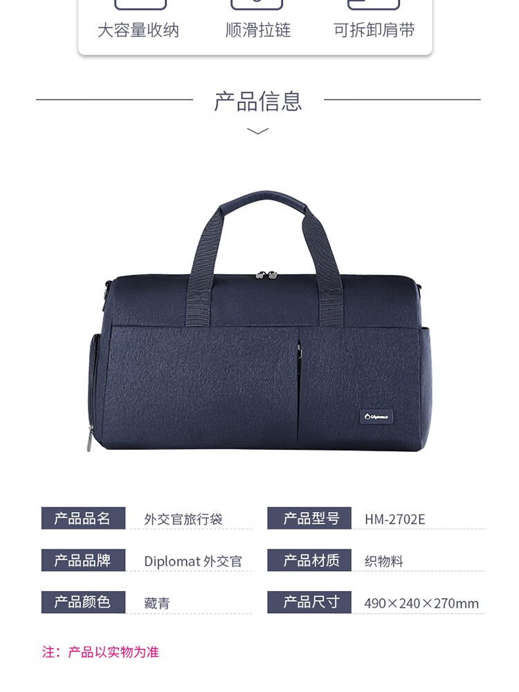 产品材质:织物料 产品颜色:藏青色 外观尺寸:490*240*270mm 产品容量:35L 产品条码:6958698320853 装 箱数量:10pc