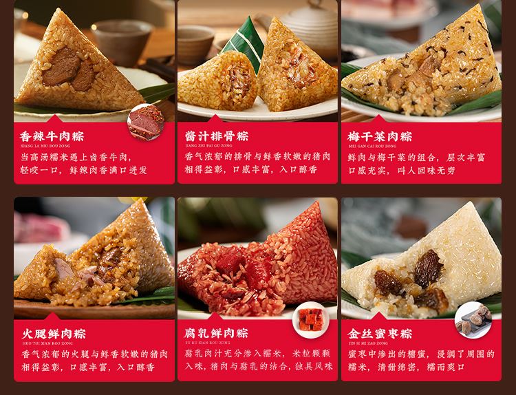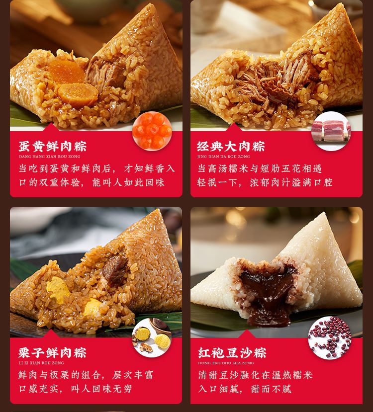 蛋黄鲜肉粽:140克*1只/袋 经典大肉粽:140克*1只/袋 栗子鲜肉粽:140克*1只/袋 酱汁排骨粽:140克*1只/袋 梅干菜肉粽:140克*1只/袋 香辣牛肉粽:140克*1只/袋 火腿鲜肉粽:140克*1只/袋 腐乳鲜肉粽:140克*1只/袋 红袍豆沙粽:140克*1只/袋 金丝蜜枣粽:140克*1只/袋