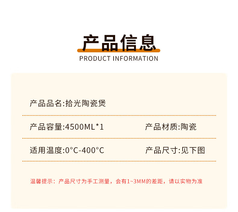 材 质:陶瓷装 箱 规格:6套 /箱产品参数:陶瓷煲4500ml彩盒尺寸:269*235*345mm 外箱尺寸:72.3*55.4*36.1cm