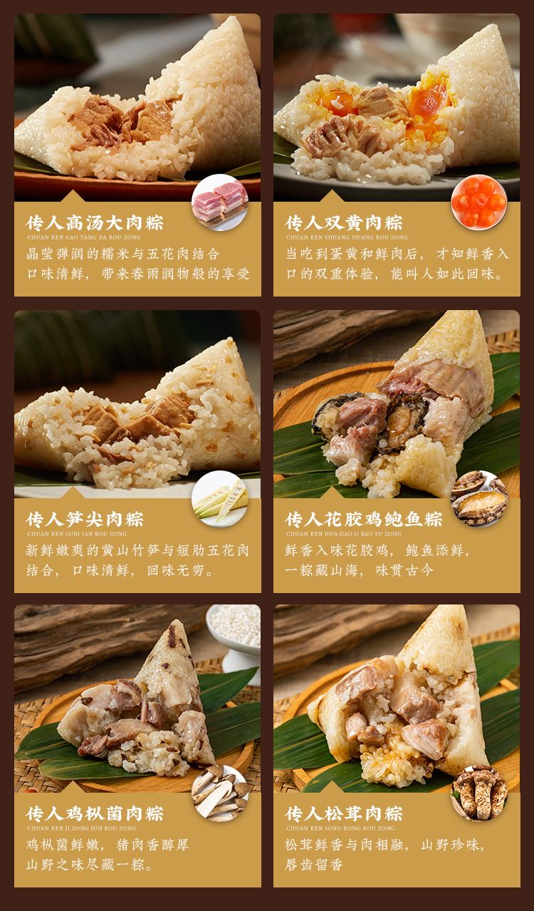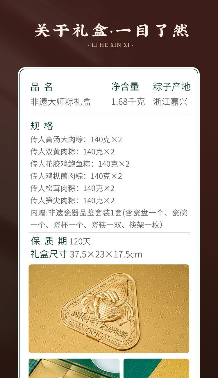 传人高汤大肉粽:140克*1只/袋*2袋 传人双黄肉粽: 140克*1只/袋*2袋 传人花胶鸡鲍鱼粽:140克*1只/袋*2袋 传人鸡枞菌肉粽: 140克*1只/袋*2袋 传人松茸肉粽: 140克*1只/袋*2袋 传人笋尖肉粽: 140克*1只/袋*2袋 内赠:非遗瓷器品鉴套装1套(含瓷盘一个,瓷碗一个,瓷杯一个,瓷筷一双,筷架一枚)