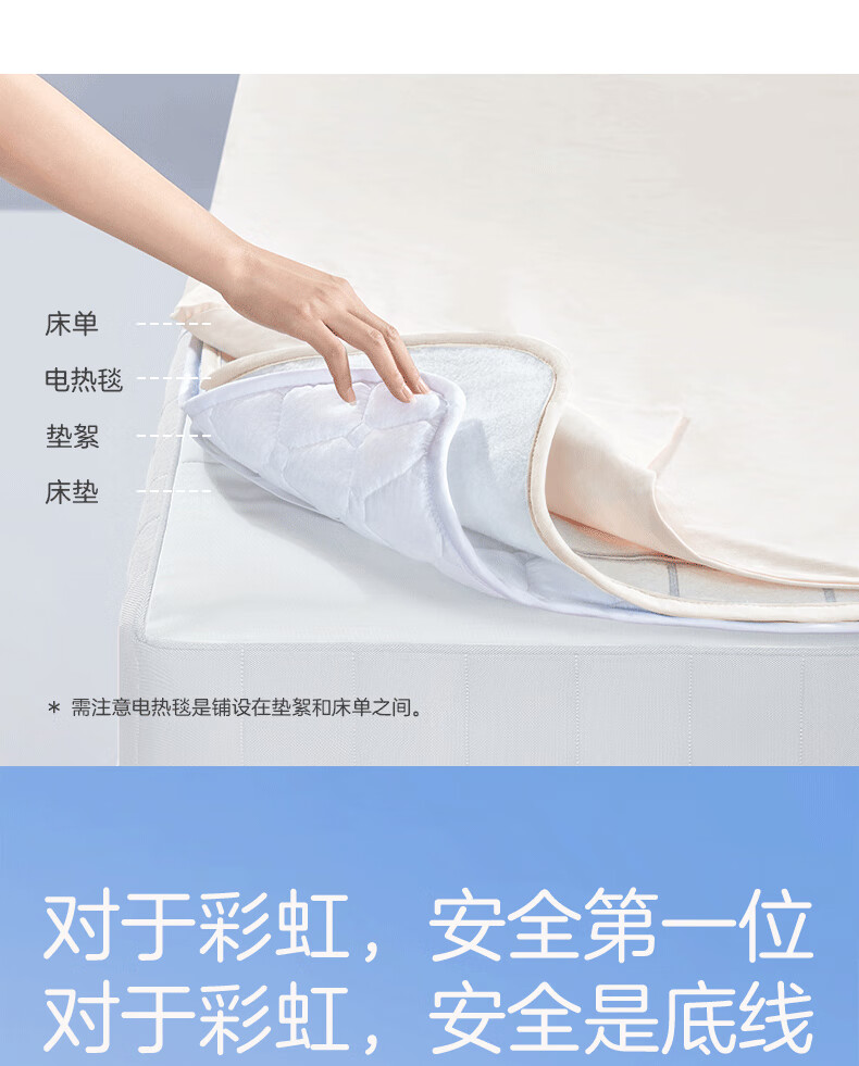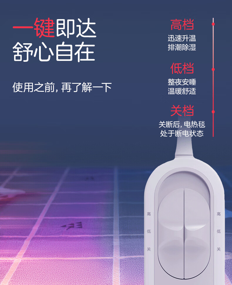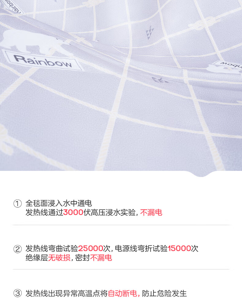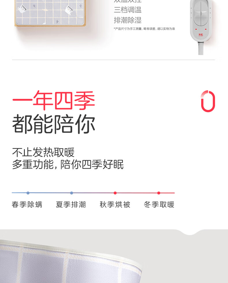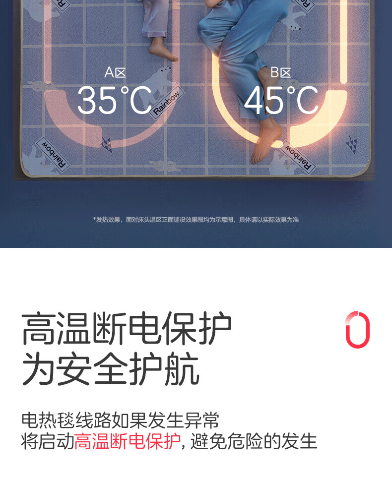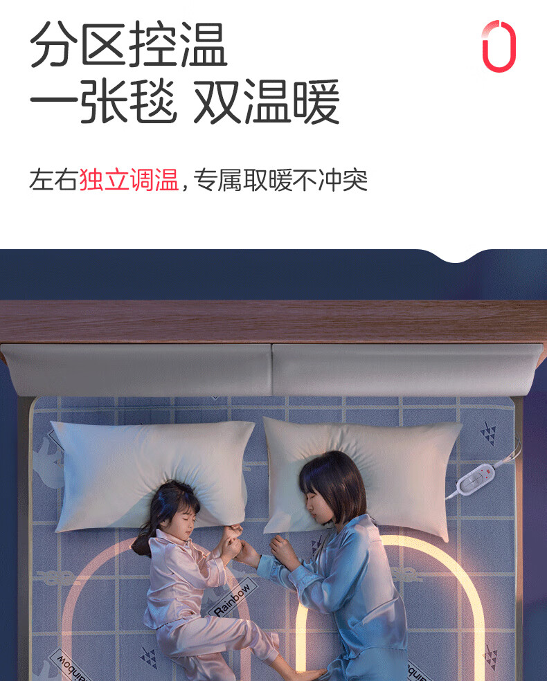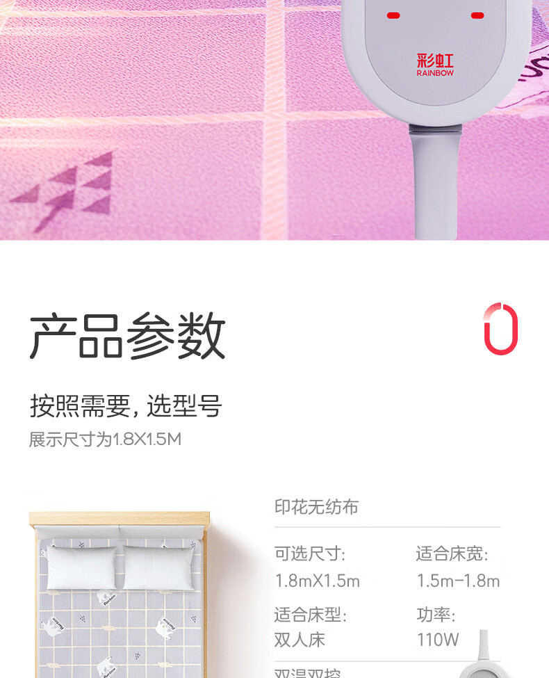 ①货号:XL1352 ⑤附加功能:左右独立控温 ②尺寸:1.8米*1.5米③面料:化纤 ④功率:110W