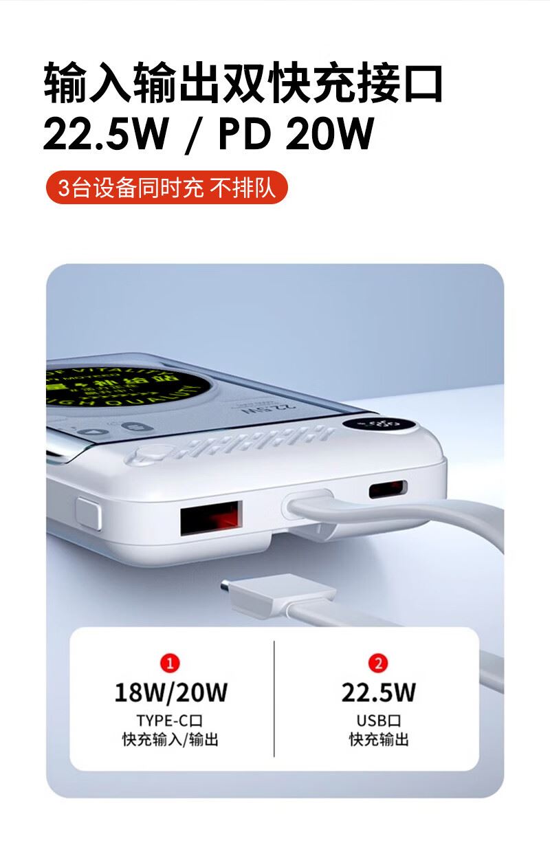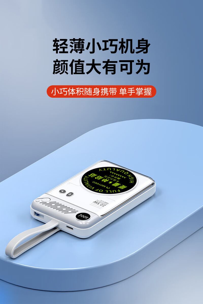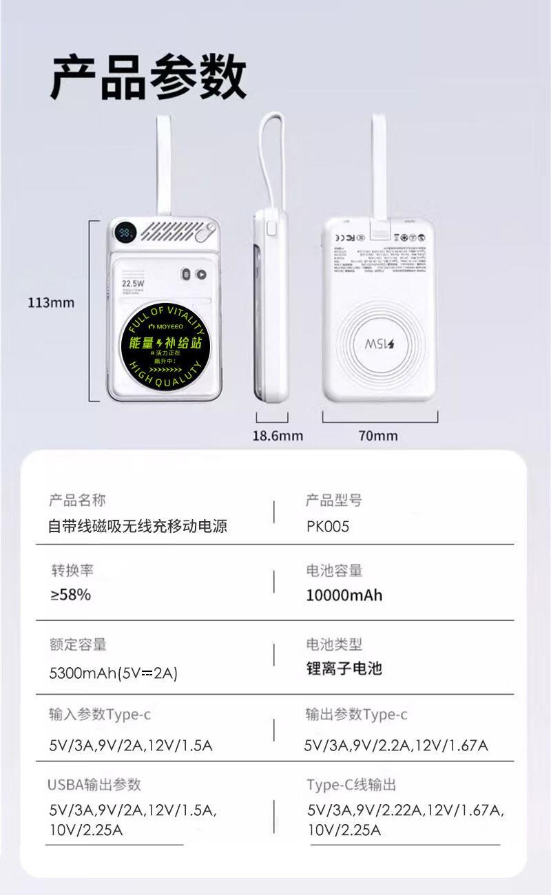 型号:PK005 容量:10000mAh(38.5Wh) 颜色:白色 材质:ABS+TPE线 产品尺寸:113*70*18.6mm 包装尺寸:168*103*36mm 产品重量:200g