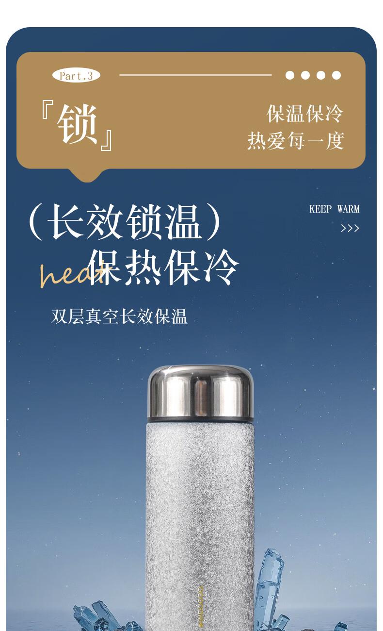 产品尺寸:160x65mm 水壶容量:300mL 产品材质:覆钛涂层+304不锈钢、食品级硅胶 产品重量:约192g 产品颜色:冰晶纹银、冰晶纹蓝 杯身工艺:覆钛涂层、冰晶纹理工艺 彩盒尺寸:67*67*162mm 手提袋尺寸:200*80*160mm