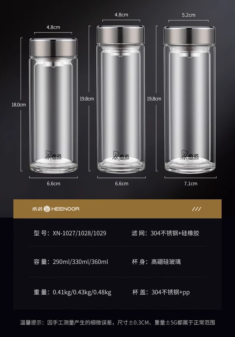 容量 XN-1017S:410ml 规格(mm) XN-1017S:52(杯口直径)x71(直径)x219(高度) 杯体 双层高硼硅玻璃 杯盖 进口食品级PP、304不锈钢 滤网 304不锈钢、进口食品级硅胶 密封圈 进口食品级硅胶 重量 XN-1017S:0.53kg 颜色 本色