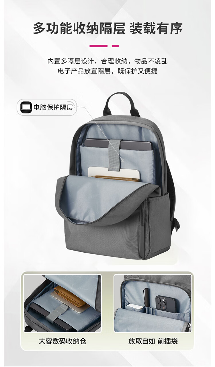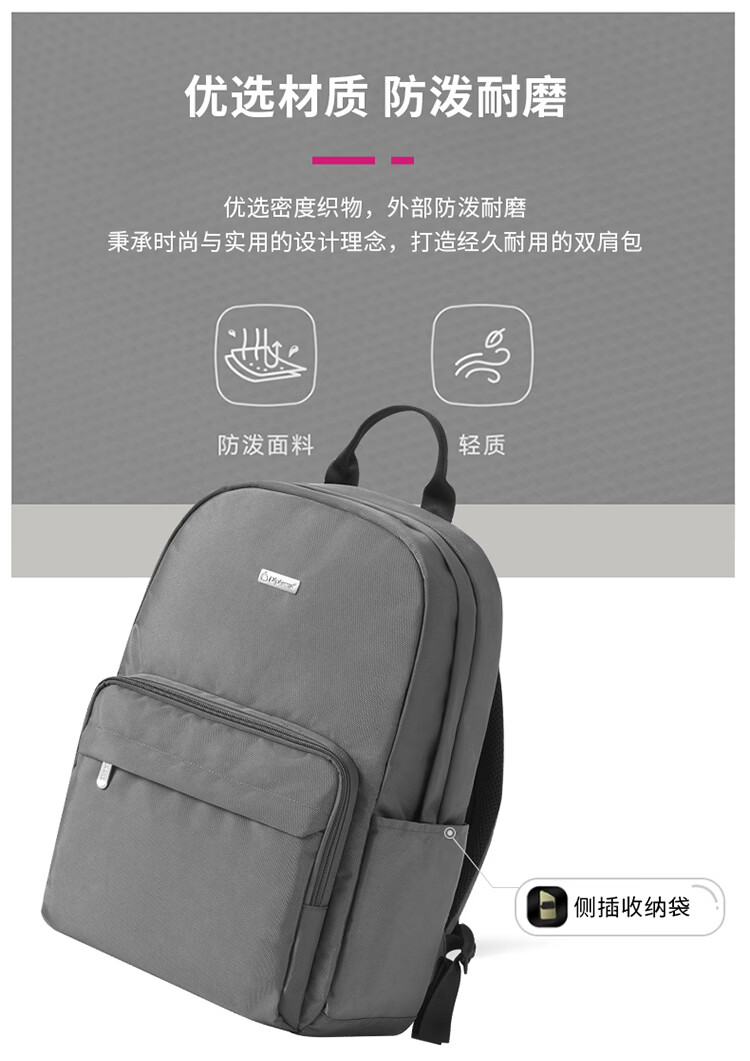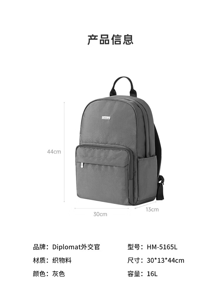 产品材质:织物料 产品颜色:灰色 外观尺寸:300*130*440mm 产品容量:16L 产品条码:6958698326442 装 箱数量:15pc