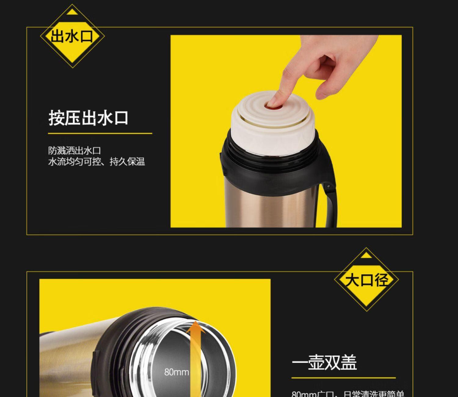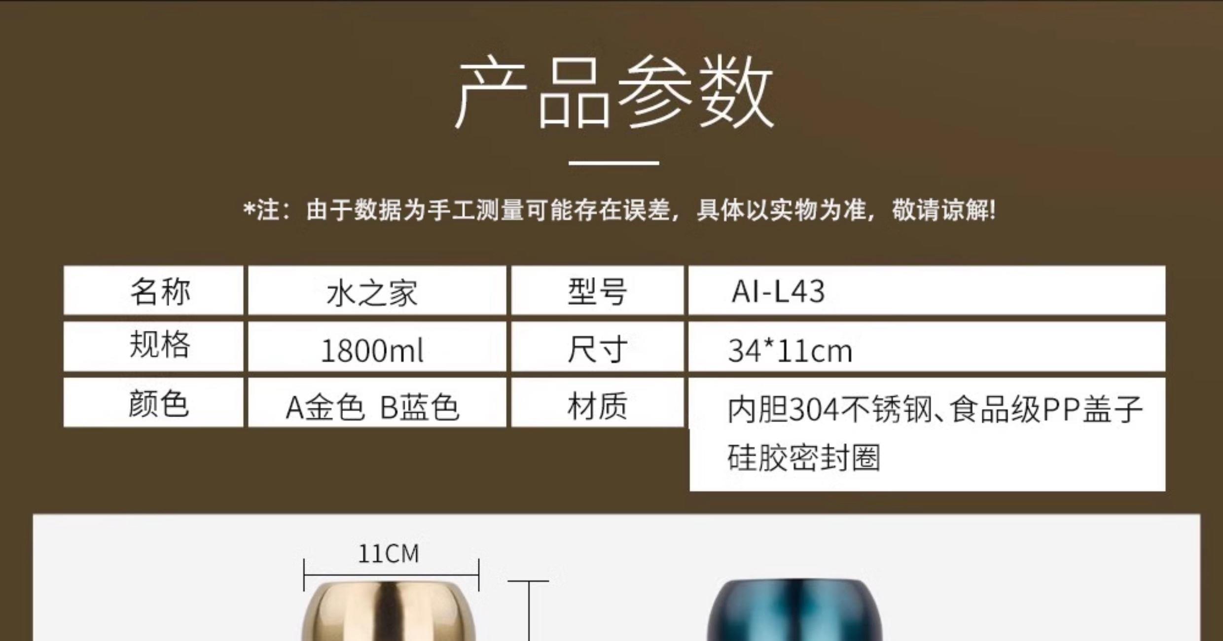 型号:AI-L43 颜色:A金色;B蓝色 规格:1800ml 装 箱率:12只/箱 材质:内304、外201不锈钢