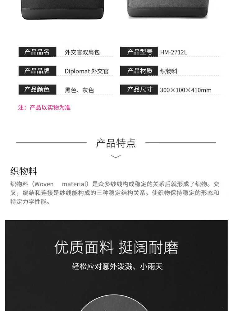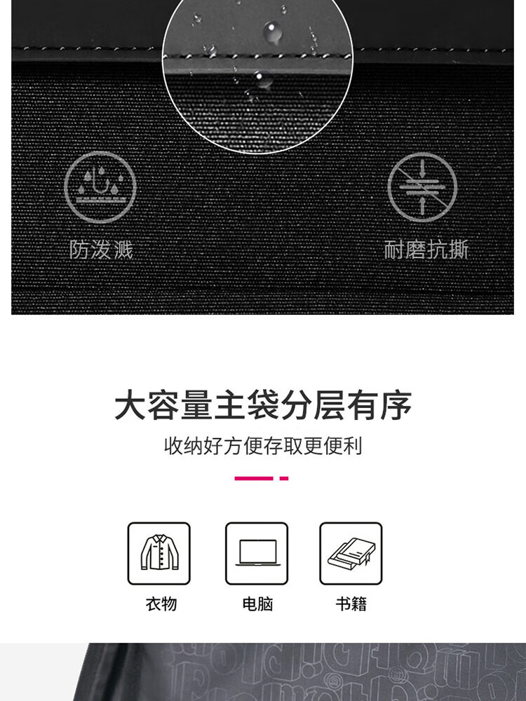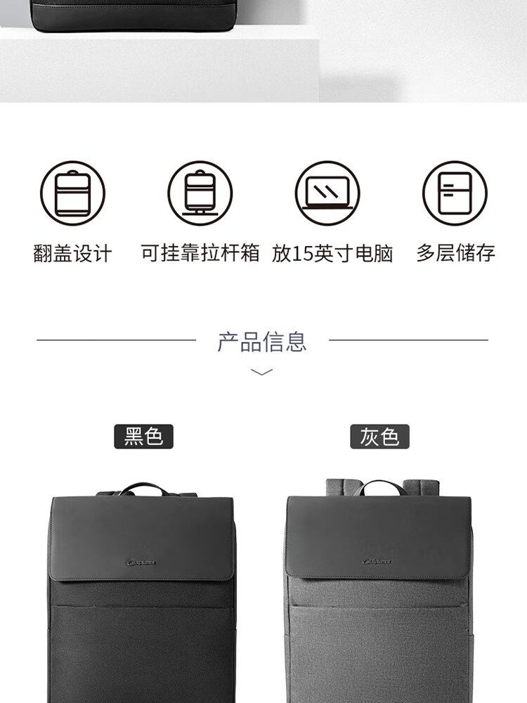 产品材质:织物料 产品颜色:黑色(-1)/灰色(-2) 外观尺寸:300*100*410mm 产品容量:17L 产品条码:6958698322697 产品条码:6958698322703 装 箱数量:10pc