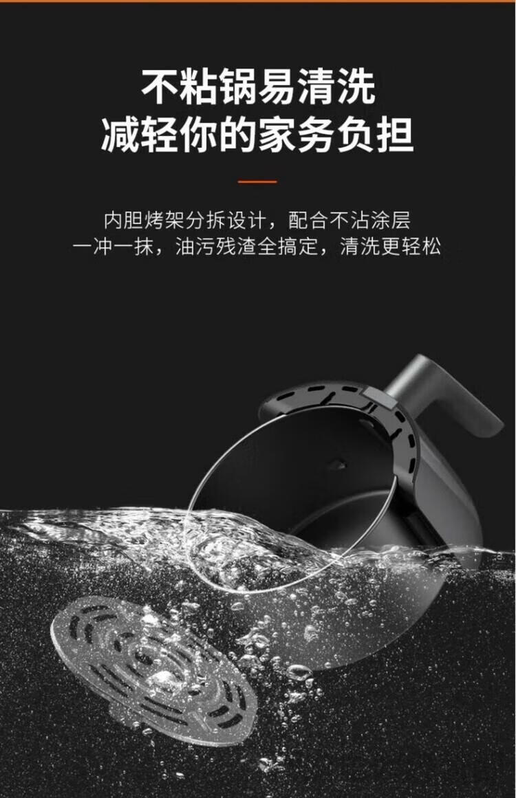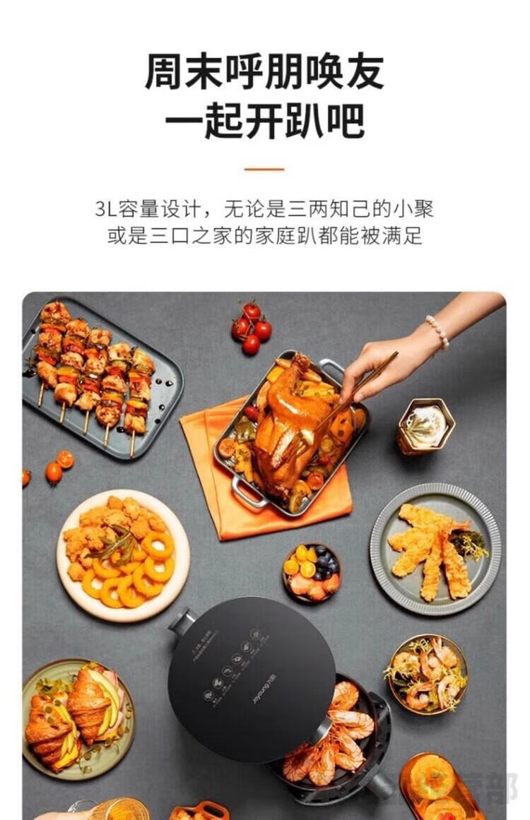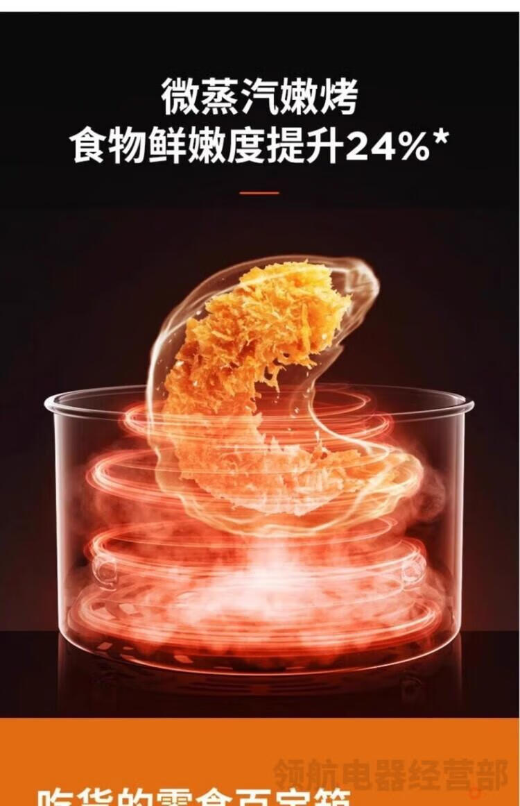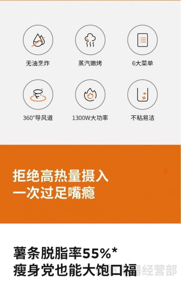 1、3.L大容量 1300W大功率 2、无油烹炸,蒸汽嫩烤 3、6大菜单,不粘易洁 4、360度空气循环,温度可调 5、烧烤、煎炸、烘焙、休闲均可
