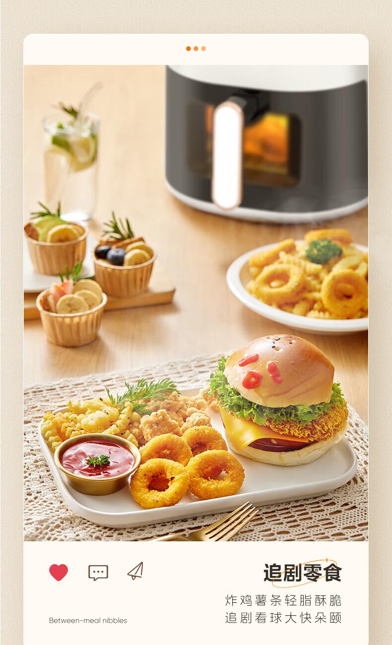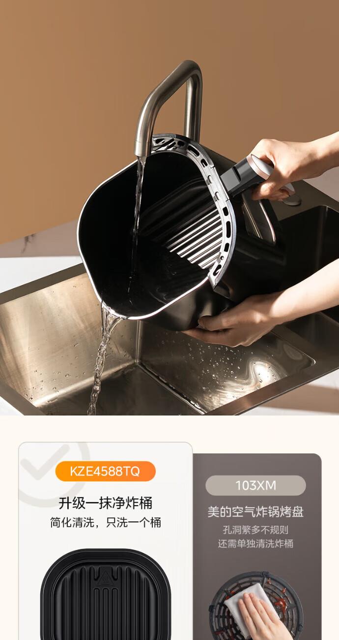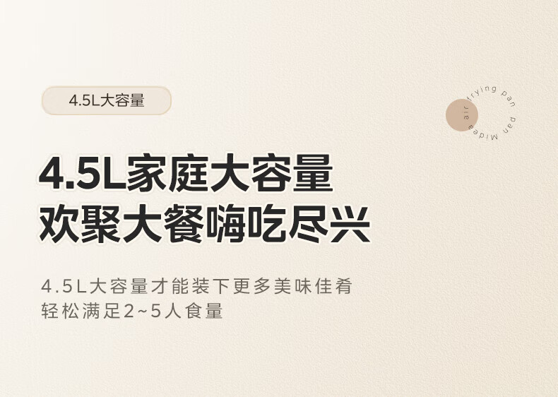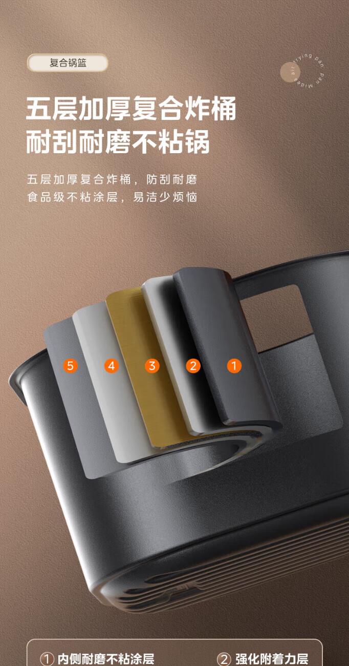 1.双旋钮可视 2.升级一抹净炸桶,清洁快速不费力 3.五层加厚复合炸桶,耐刮4.耐磨不粘锅4.5L家庭大容量